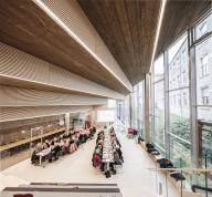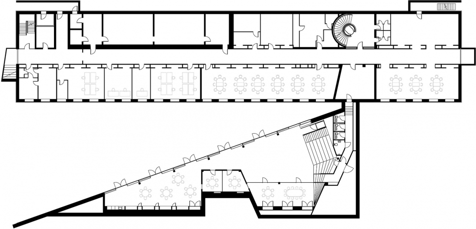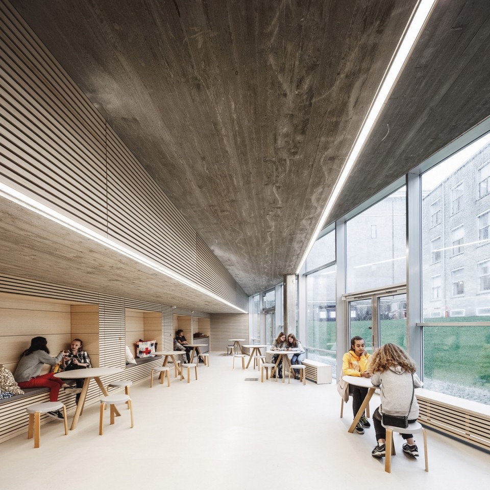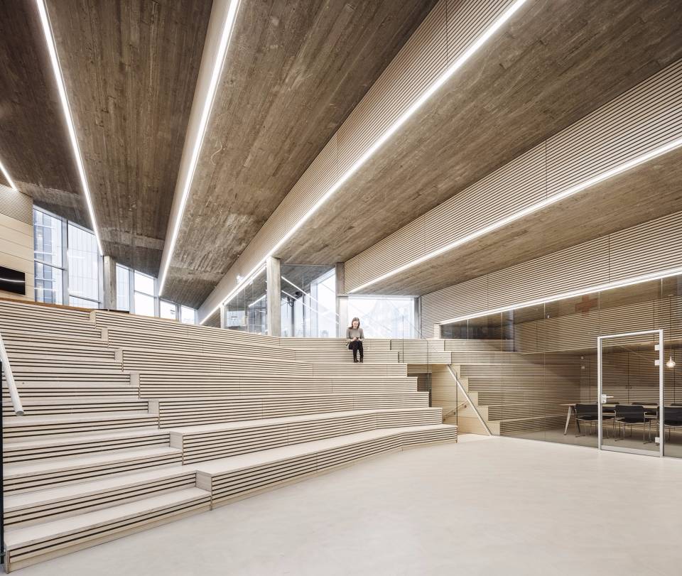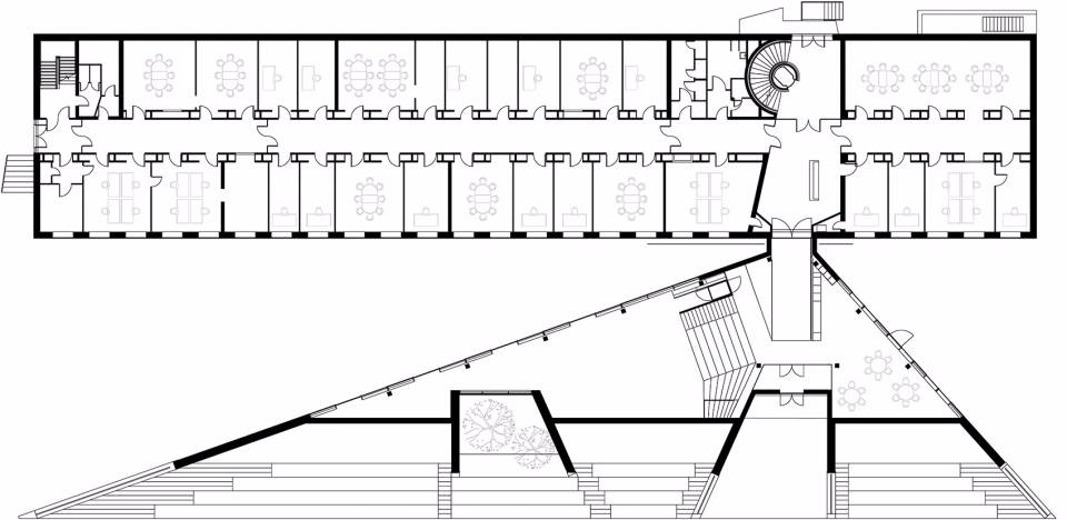 進(jìn)入內(nèi)部,人們可以看到一個(gè)志愿者中心和總部共享的入口區(qū)域。區(qū)域左側(cè)是志愿者之家開放的臺階和一個(gè)可容納100人的會堂。這個(gè)地方通向一系列可以用于培訓(xùn)、會議、公開活動(dòng)、放映電影和其他活動(dòng)的會議室。臺階屋頂朝向總部開放,在志愿者之家的任何位置都能夠看到這個(gè)地方。原有建筑與擴(kuò)建建筑通過一個(gè)綠色公園進(jìn)一步連接。紅十字會志愿者之家也為員工和志愿者提供了一個(gè)可以見面的共有空間,從而為蓬勃發(fā)展與合作提供了理想的條件。