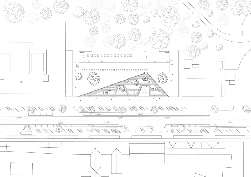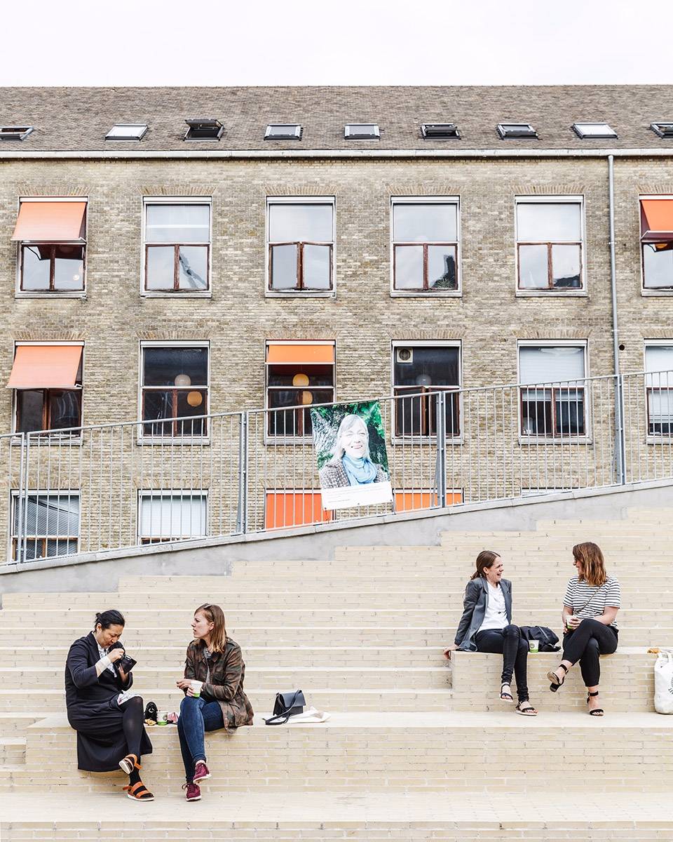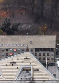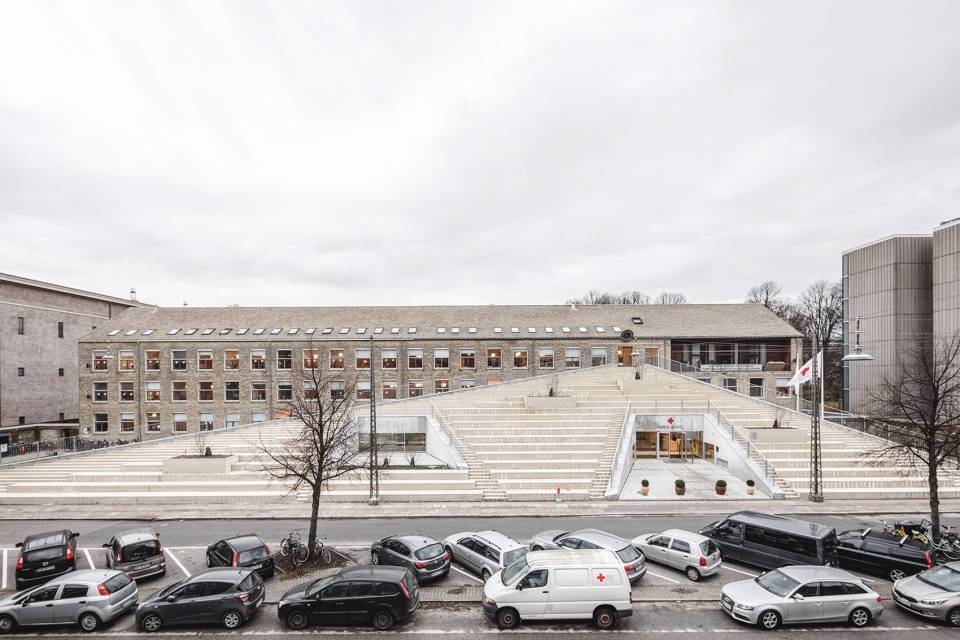 壯觀的斜坡樓梯屋頂,與相鄰的F?lledparken公園、丹麥共濟(jì)會和由前哥本哈根市政廳改造成的黃色磚墻的紅十字會總部共同融入并詮釋了這一區(qū)域的特征。階梯屋頂是用與紅十字會總部同樣的黃色磚塊砌成的,它成為一個(gè)很受歡迎的聚會場所——在夏天,志愿者與工作人員在這里聚會,路人在這里停下休息,當(dāng)?shù)厝嗽谂_階上做各種事情,從鍛煉到喝咖啡。