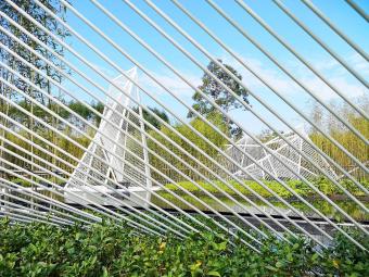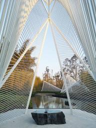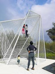三為“高”,通道從“墨池”里徐徐抬升,行至山腳,非仰觀不能看“蒼峰”之全貌,也可進(jìn)入山洞內(nèi)探究,有山峰雄健、別有洞天之感?!吧n峰”是花園唯一對稱的形體,其挺拔向上的形態(tài)和潔白純凈的色彩,在天空和光線的作用下,形成適合冥想和靜思的精神空間。