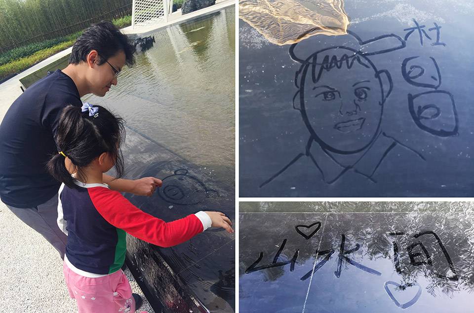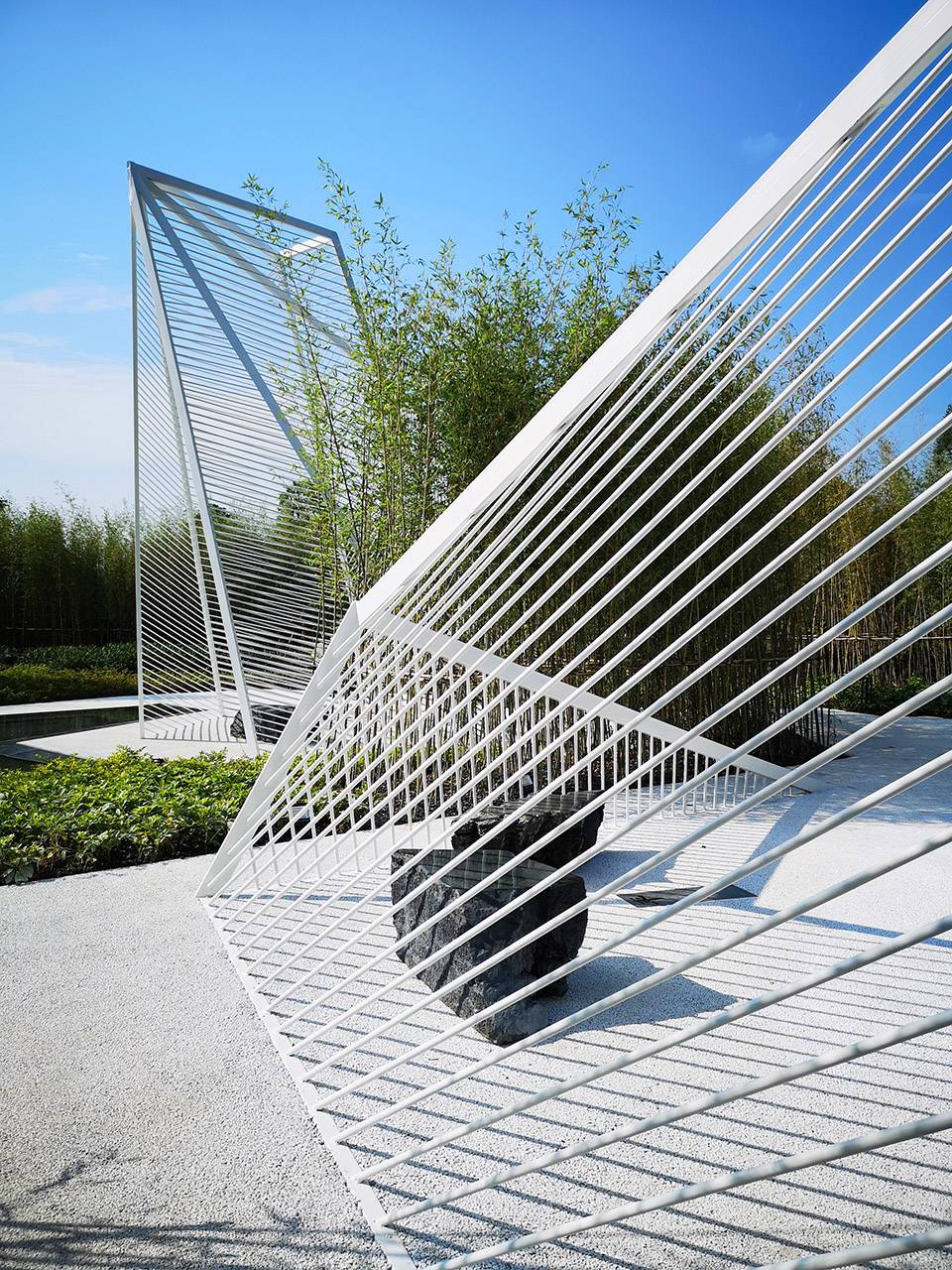 二為“闊”,從“墨池”遠(yuǎn)望對岸山丘,水中山影粼粼,有空間延展、水廣山遙之感。在有限的花園空間中,通過鏡面水池將空間擴(kuò)展一倍,并增加花園對光、風(fēng)、雨等天氣變化的反饋。
