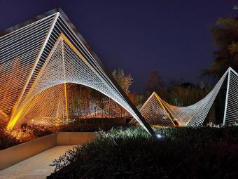 一為“深”,從下沉通道穿過層層山丘,前后相窺,有重巒疊嶂、層次深邃之感。山丘的表皮是由白色鋼柱焊接形成的非線性曲面,這些曲面前后相疊,隨著人視線的移動(dòng)而不斷變化。