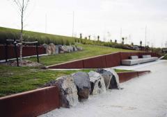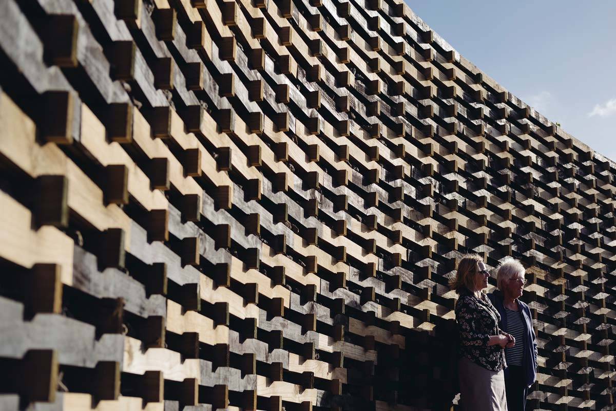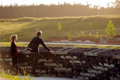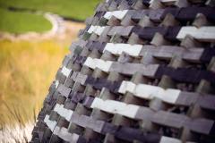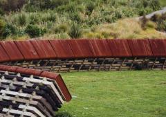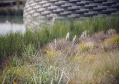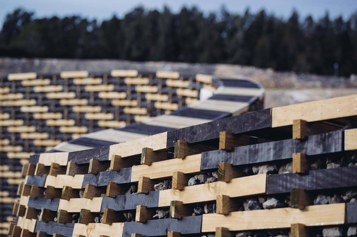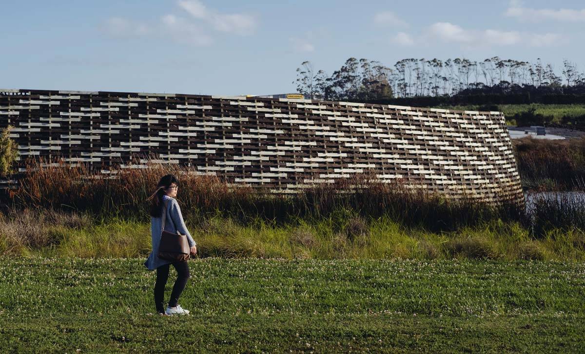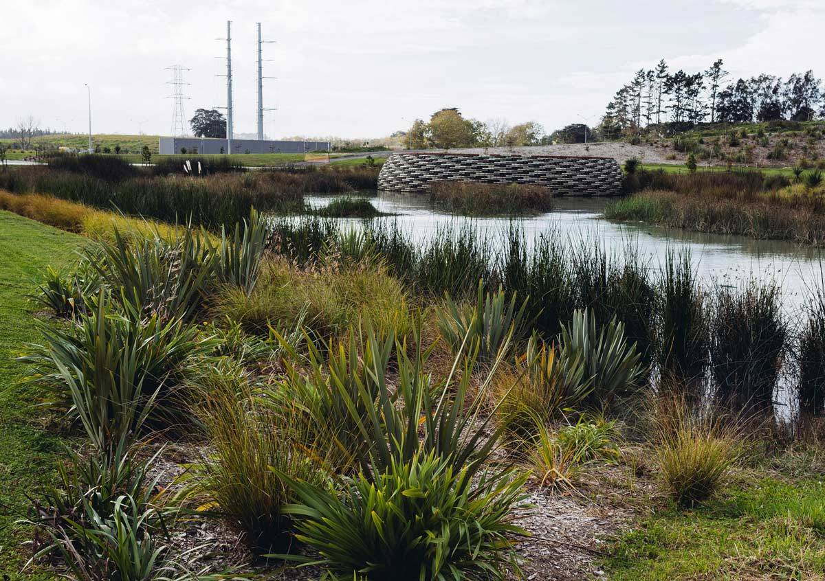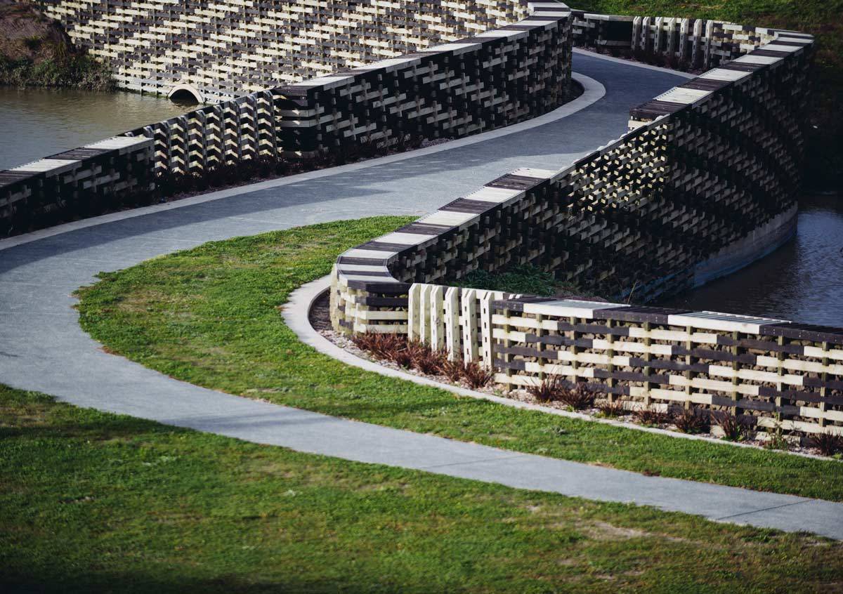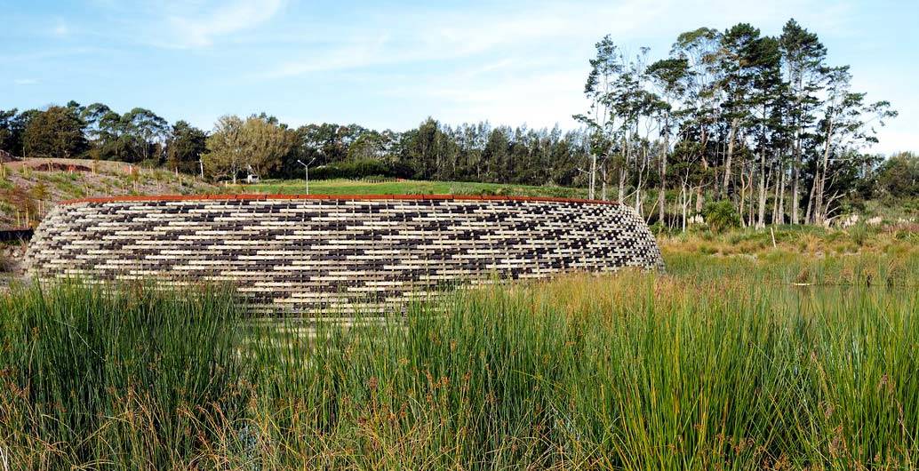 該項(xiàng)目最突出的是文化方面,尤其是曲折的“木籃”,融入到3個(gè)水塘濕地的邊緣中。這些功能性雕塑抽象地代指亞麻編織的籃子和鰻籠。雖然這些形式復(fù)雜、訂制的,事實(shí)上它們是由標(biāo)準(zhǔn)的木籠式防護(hù)系統(tǒng)建造而成:一個(gè)現(xiàn)成的系統(tǒng),適應(yīng)曲線型傳統(tǒng)編織結(jié)構(gòu)的表現(xiàn)方式。