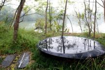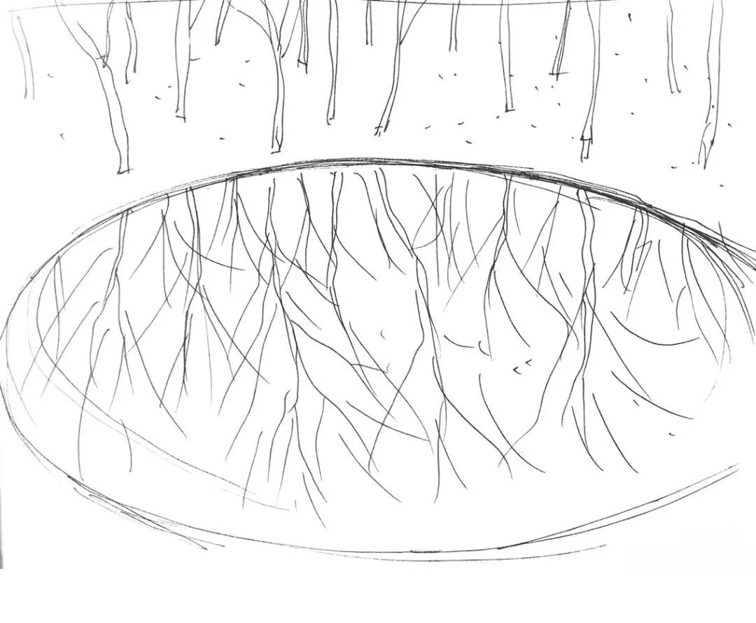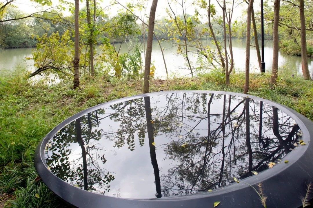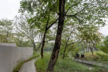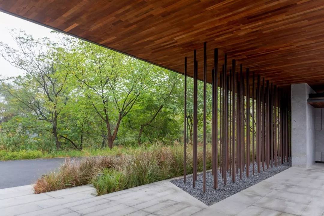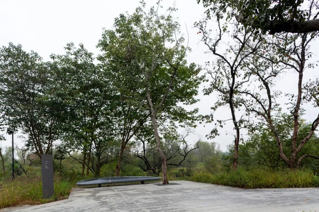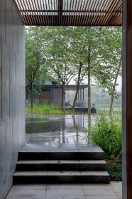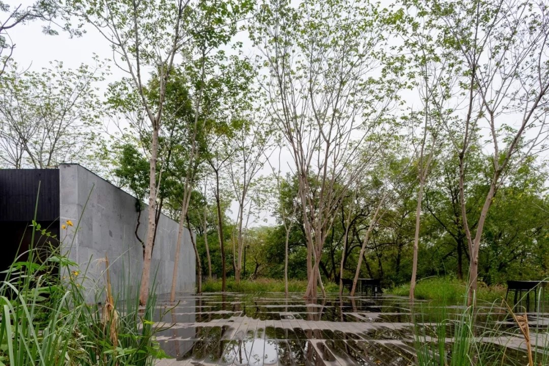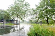 水塘兩邊的路都可以通向客房區(qū)。主路的途中可以遠眺西側(cè)開闊的水塘,一條意為“夏至”的石凳,被一條代表北回歸線的金屬線切分。如果科學(xué)的講,夏至這一天北回歸線被太陽直射,并且“日長之至,日影短至”,希望此石可間表其意;另一條通往客房的小路會途徑“雨水”的雕塑,笸籮形的水臺有不同維度的變坡,水滿則溢。如節(jié)氣歌中所說:“南濕北冷兩交鋒,咋暖還寒斗雨風(fēng)”。中國古老的節(jié)氣反映了農(nóng)耕時期人們的智慧,我們用它暗示了西溪農(nóng)業(yè)景觀的背景。
