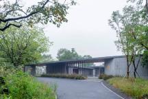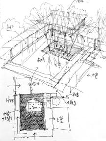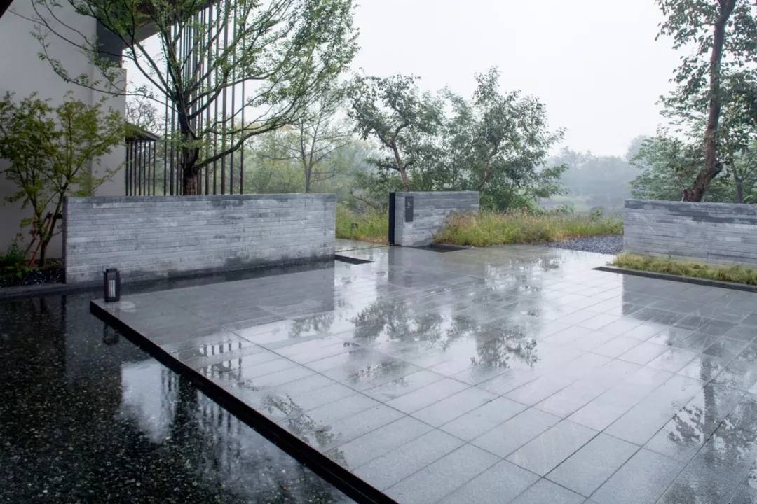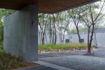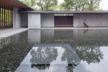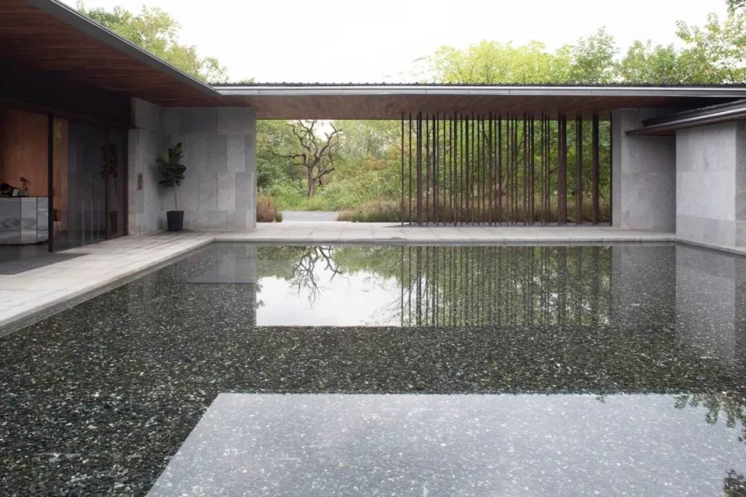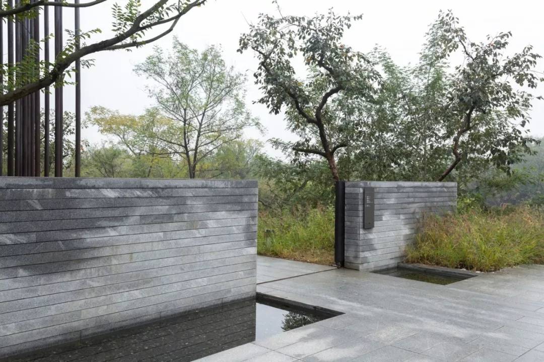 現(xiàn)場的大樹都不是原生的,因為地氣不和(或者先天不足)長勢并不很好。我們本著就地保護的原則物盡其用,根據(jù)它們的位置和標高,做了矮墻和礫石停車場;大堂及回廊環(huán)繞的水池,水放干時可做車展,水滿為婚慶提供背景。池底選放黑色礫石,給大的水面隱隱質(zhì)感。水中一方石,若隱若現(xiàn),內(nèi)圓與其余面積一樣,想表達“春分”之意,所謂“日月陰陽兩均天,玄鳥不辭桃花寒”。稍遠屏風(fēng)處特意孤植的一顆柿樹點題“木守”。霧白的屏風(fēng)隔開內(nèi)外、干濕兩個空間,將空間序列逐漸過渡到四周的鄉(xiāng)野。