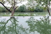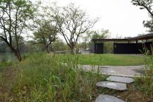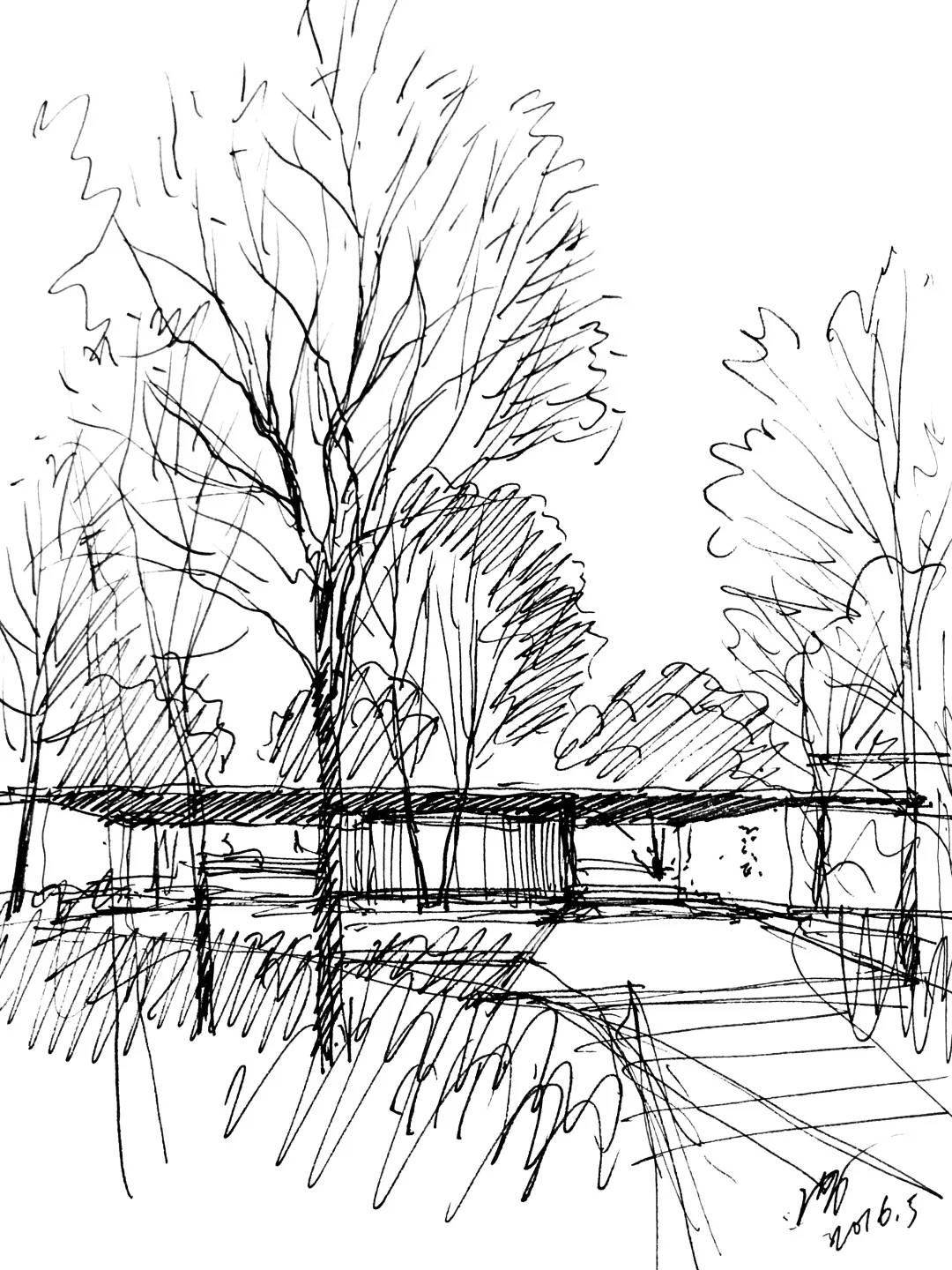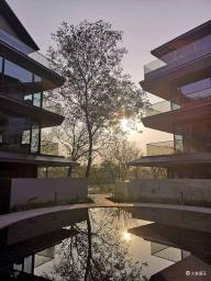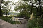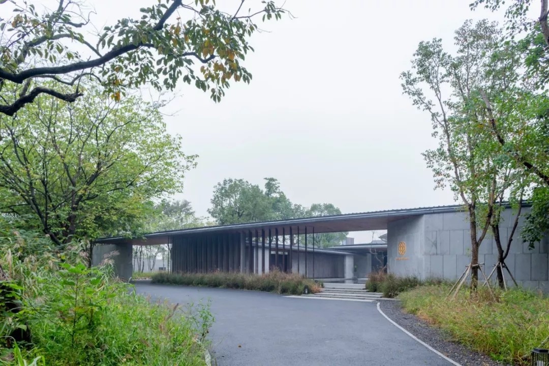我們的場地位于西溪的某一塊被荒廢的幾組舊房子(三四層高、將會被改造成酒店客房)占據(jù)的地方。場地的優(yōu)勢是在進入正題前,有比較長的敘事線——建筑師利用它做了大堂、接待、餐廳等舒坦一些的布局,讓后面高的客房沒有突兀的跳在人眼前;景觀利用它做了兩層入口——進入公園里常見的類似拐彎的敞口后,再進來一百米是有管理的門口,車開進,再有人車分流的入口。長而古老的敘事方式雖然古典,但是不慌不忙的鋪墊。