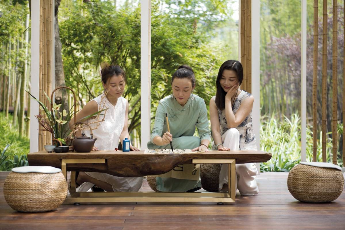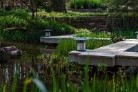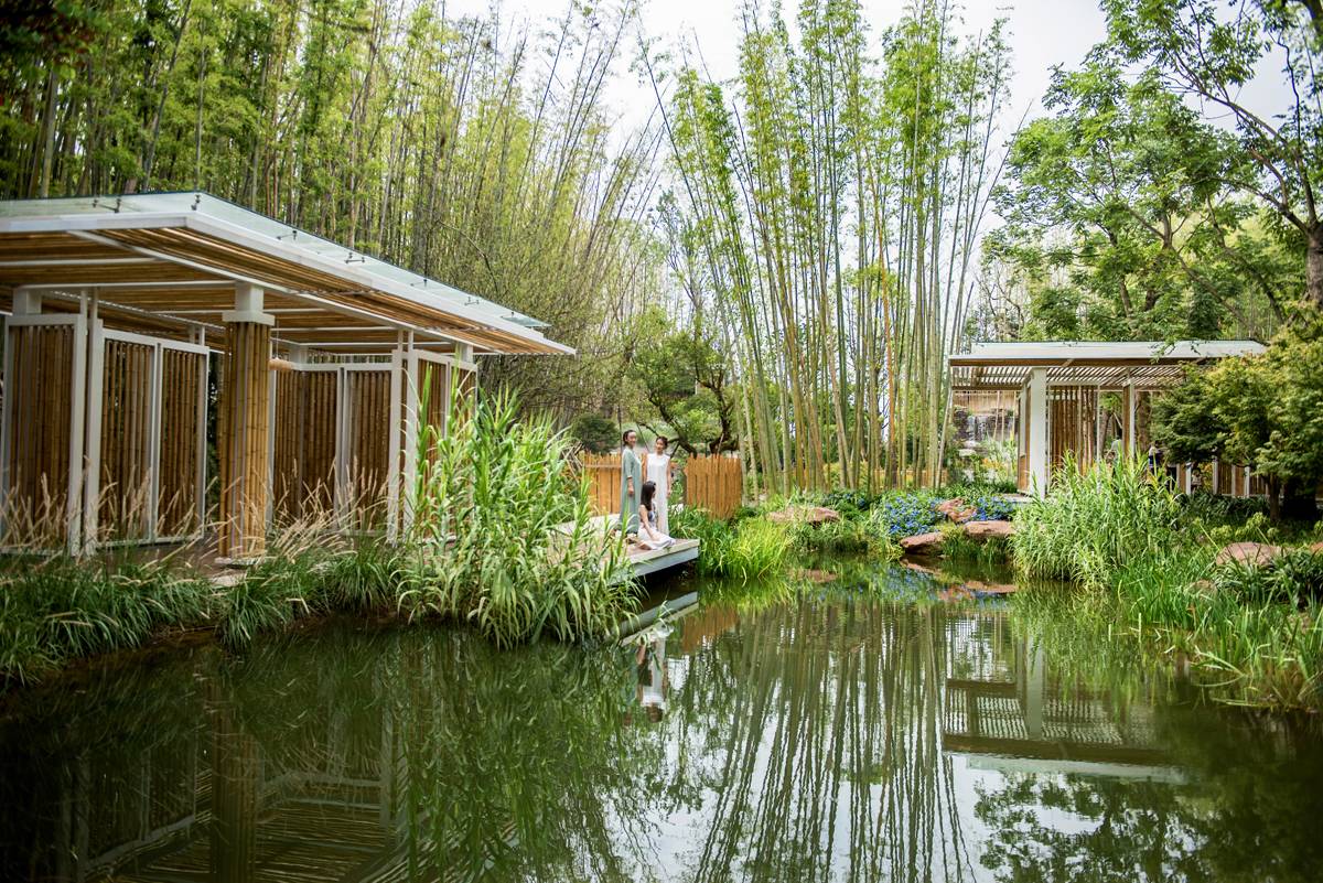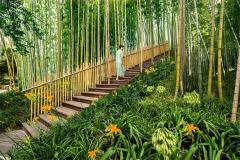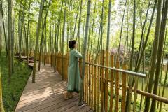 一條蜿蜒的溪水自西向東流過竹隱園。北入口處的竹林引導(dǎo)人們進(jìn)入這一秘境,高大的竹子過濾了塵世的喧囂,漫步林蔭,泉水叮咚作響,使人逐漸放空心情,忘卻煩惱。沿溪而上是三座高低錯(cuò)落的竹舍隱于山畔溪邊,翠林深處匯聚一汪池水,池畔竹舍別具匠心的設(shè)計(jì)了轉(zhuǎn)門,最大限度的將竹溪美景納入亭中。不遠(yuǎn)處的梯田式的疊水景觀,猶如一幅徐徐展開的文人畫卷,體現(xiàn)出隱逸的耕讀之美。由南側(cè)入口拾級(jí)而下至開闊靜謐的水面,水面之上的九曲橋玲瓏別致。人們可以在竹林里散步下棋,在迷人的竹屋中喝茶會(huì)友,在安靜的氛圍中瑜伽、冥想。