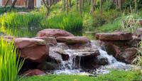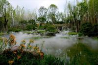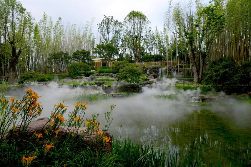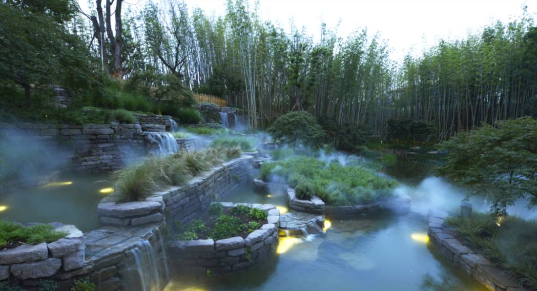 綠島上間或點(diǎn)幾株紅楓,搖曳生姿。擋墻上做了許多半圓形的水口,在安排上也刻意的讓其錯(cuò)落有致。疊水下是寬闊的水面,上面布置曲橋,用現(xiàn)代的手法展現(xiàn)了傳統(tǒng)園林九曲橋風(fēng)情。最后,在疊水上點(diǎn)綴上霧噴,于是一處如仙境般飄渺唯美的存在變誕生了。