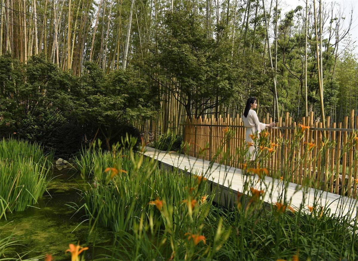 Δ 憑欄遠(yuǎn)眺,放眼碧波蕩漾的竹海,青翠欲滴,微風(fēng)拂面