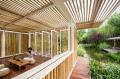 場(chǎng)地入口處被設(shè)計(jì)成一組類似于竹林的密集的線條集,將整個(gè)園林巧妙地藏在竹海中,正是以這種若隱若現(xiàn)的方式,制造出一種具有特殊質(zhì)感的入口。漫步竹林中,竹子縱橫交錯(cuò),營造出豐富的視覺效果。高高的竹條圍合成戶外步行道,排列的竹條豐富了立面的節(jié)奏變化,在保證私密感的同時(shí),并不會(huì)遮擋遠(yuǎn)處景觀和室內(nèi)空間的視覺聯(lián)系。
