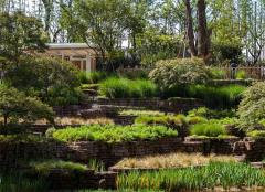 地塊最南端是園區(qū)的最高點(diǎn),也是紅石公園整體最高的水源。設(shè)計(jì)團(tuán)隊(duì)將場(chǎng)地內(nèi)七米的高差設(shè)計(jì)為疊瀑的形式,以紅砂巖壘砌的層層疊疊的矮墻將高差變得豐富而有層次。同時(shí)在其中穿插多個(gè)的綠島,種植上豐富的觀賞草和地被植物,使紅砂巖矮墻在其中變得半遮半掩,神秘了起來。矮墻層疊的結(jié)構(gòu)如同古代文人耕種的梯田,使人想起陶淵明歸園田居,采菊東籬的脫塵意境。