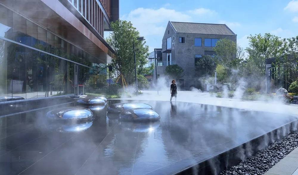 不銹鋼的卵石雕塑,盈盈立于水面,輕煙彌漫,將室外環(huán)境體驗推向高潮