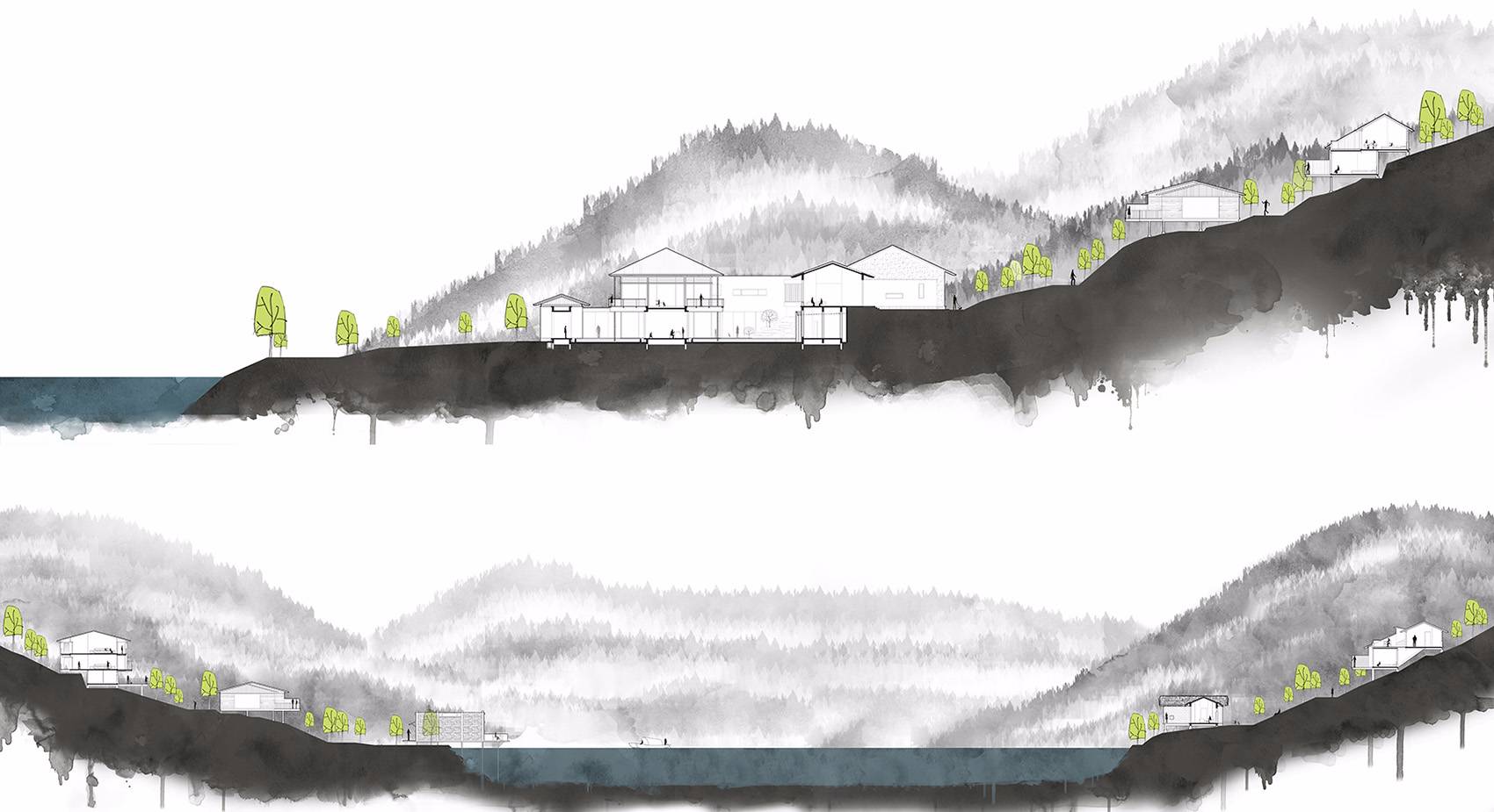 如自然界中的進程般,該項目中的雨水經(jīng)由溝渠收集、再匯入山中溪流以及中心湖中。采用人工建造的微生態(tài)濾床進行污水處理。生活污水經(jīng)過系統(tǒng)處理后,回用于綠化灌溉、道路清洗等用途,形成生態(tài)小循環(huán),避免了生活污水對于富春江的直排污染。