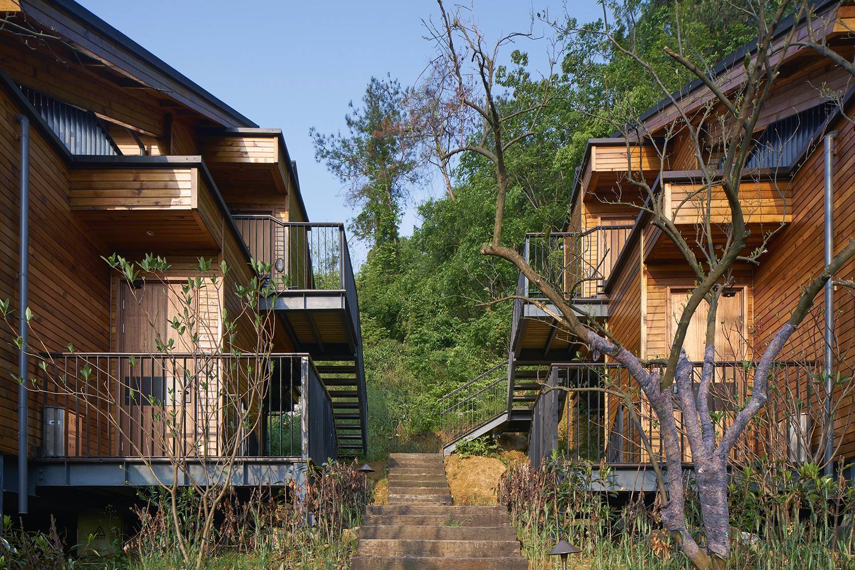 ▼客房和道路棲居于青山綠水之中