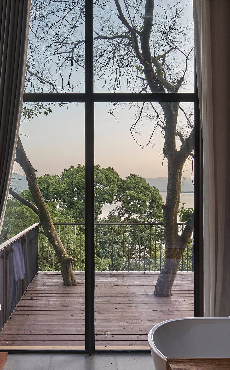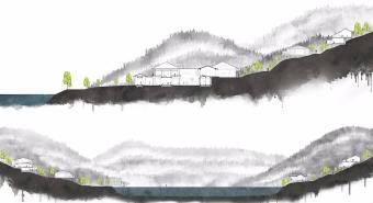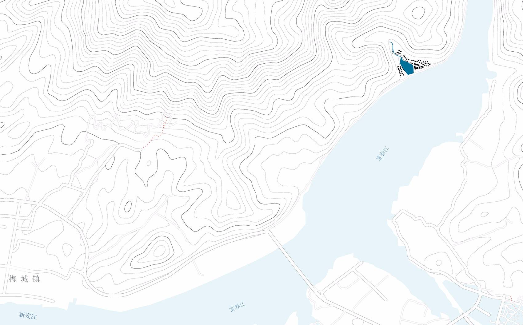 該項目地點屬沖積扇場地類型,并在其中心部位形成由山澗溪流匯集而成的集水湖區(qū),這便也決定了它在地形、水文、土壤及植被等方面環(huán)境敏感型的場地特征。距離杭州市區(qū)1.5小時的車程,建德富春開元芳草地鄉(xiāng)村酒店所在區(qū)域位于富春江沿岸視野最為開闊的部位,該酒店的建造定位即使之成為如《富春山居圖》之中所描繪的如詩般的休閑度假地,打造“結(jié)廬在人境,而無車馬喧”的現(xiàn)代田園生活方式。同時,作為建德市首家高端酒店,期望它能夠發(fā)揮帶動當(dāng)?shù)芈糜涡袠I(yè)發(fā)展,推動鄉(xiāng)村振興的積極作用。
