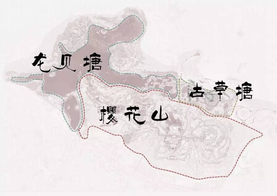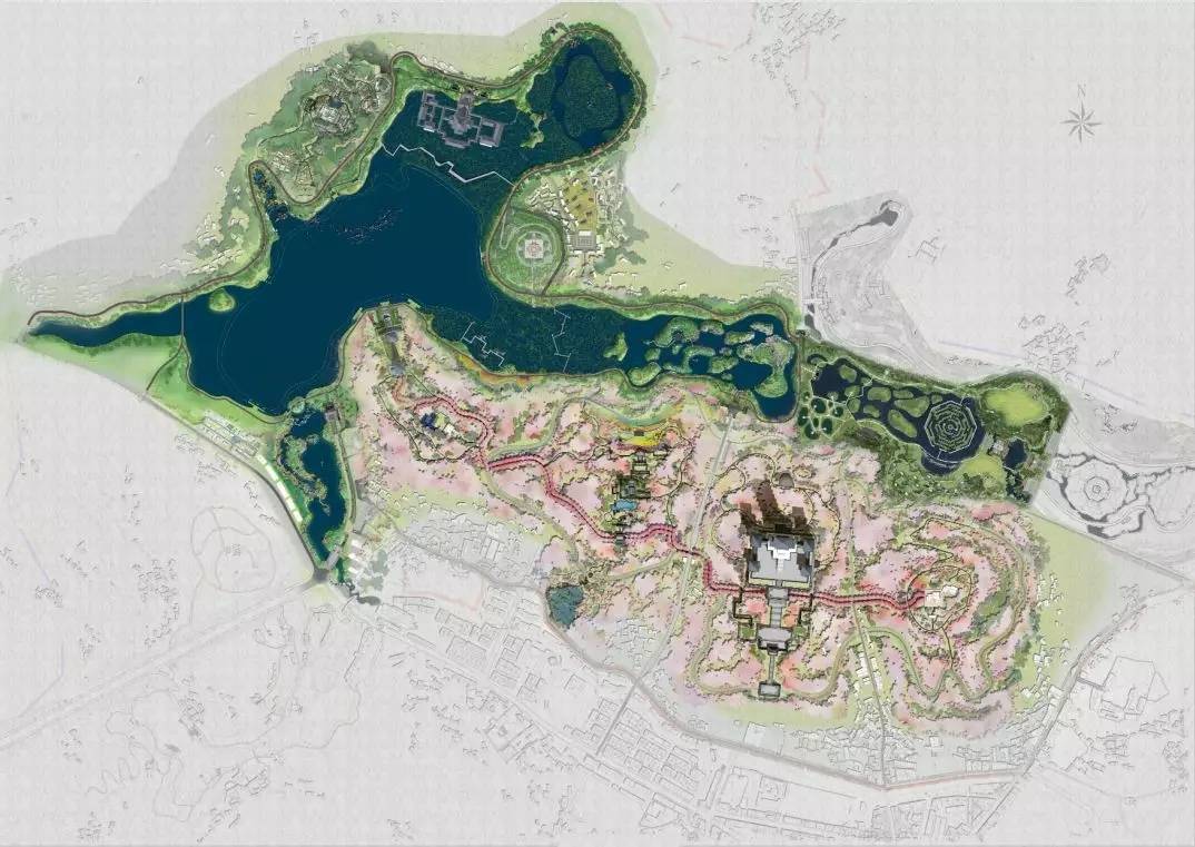 龍見(jiàn)塘水系優(yōu)美,有“一灣、一溪、雙湖、三塘、群島”。以龍見(jiàn)塘為基底,圍繞湖泊設(shè)置鷺語(yǔ)生態(tài)、宗教文化、荷塘藝術(shù)、荷畔休閑、茶禪文化等多個(gè)組團(tuán)。同時(shí),對(duì)各個(gè)組團(tuán)進(jìn)行陸地、山體、水體等景觀分級(jí),通過(guò)水路陸路交通,用古典游園流線將山水串聯(lián),融入盛唐文化游覽序列,張弛有度、步移景異、水陸相融的景觀游覽體驗(yàn)。