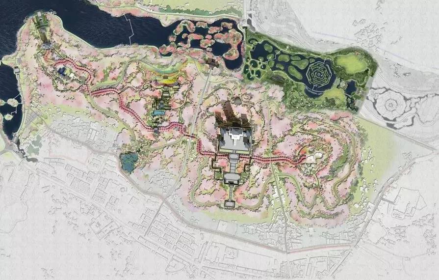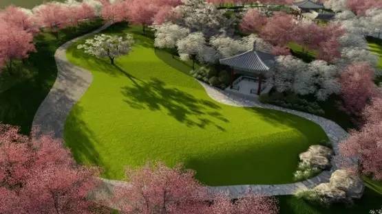 山水沁園 位于櫻花大道的起點(diǎn)處,緊挨龍門臺(tái),由疊石與櫻花共同組成,在道路設(shè)計(jì)上融入龍的元素。櫻、石、亭、臺(tái),共同組成一處既可閑庭信步,又能極目遠(yuǎn)眺的重要景點(diǎn)。