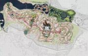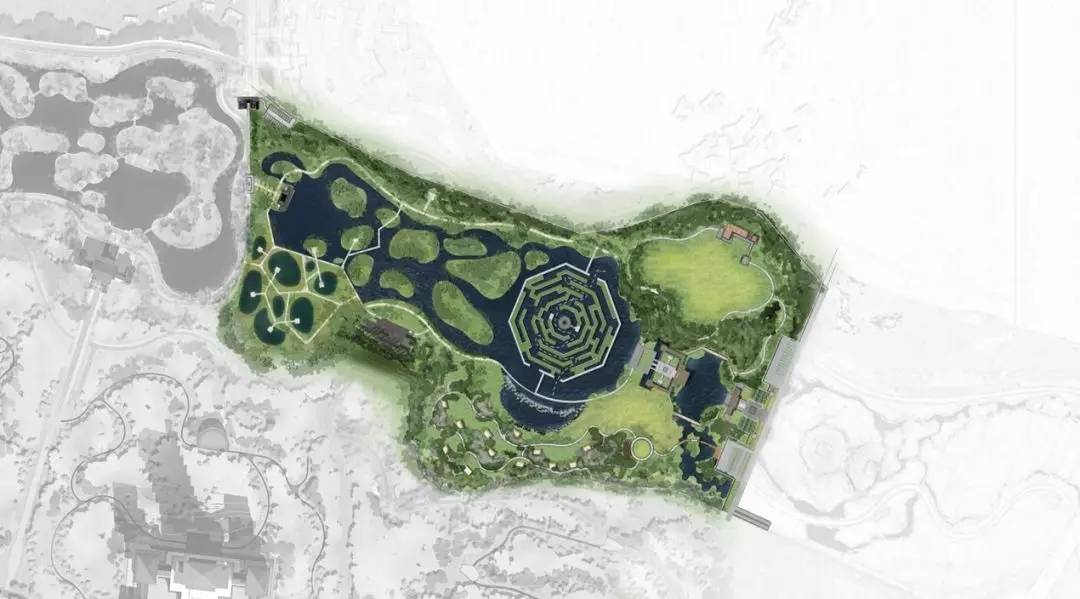 水八卦 造型來(lái)源于先秦時(shí)期的八卦思想。通過(guò)筑壩將其設(shè)置成為迷宮,游人可通過(guò)水陸兩種方式到達(dá)中心渾天儀,上覆球狀頂棚,繪制紫薇垣星圖,融入中國(guó)古代天文文化。