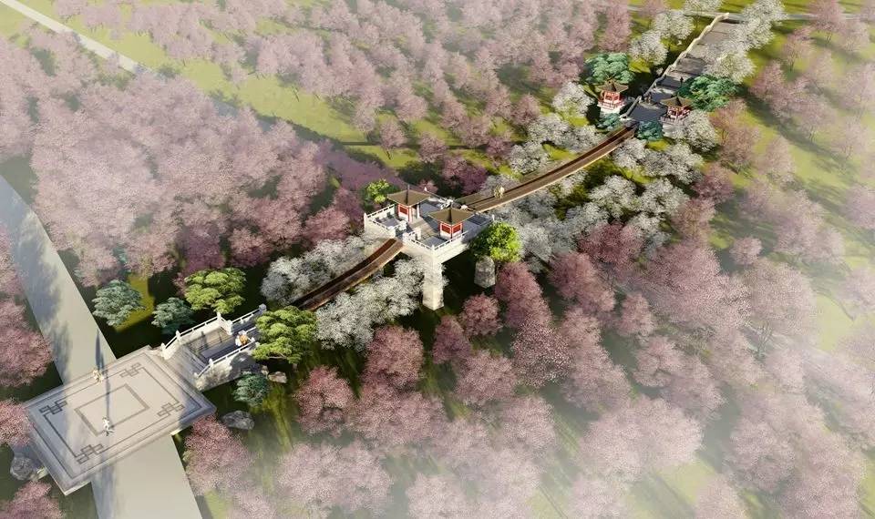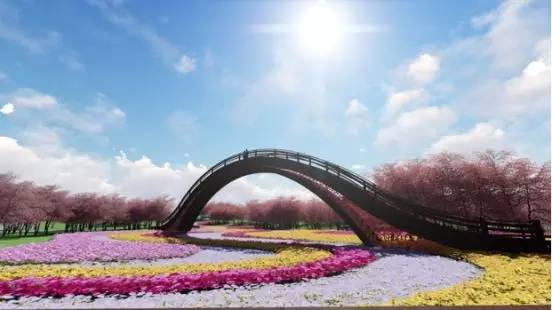 踏浪尋芳 西側(cè)與山水沁園毗鄰,東側(cè)為花神居。踏浪尋芳在花田之上架起一座觀景橋,櫻花大道上的游人可通過(guò)棧道漫步橋上,欣賞花田美景,如置身花海。