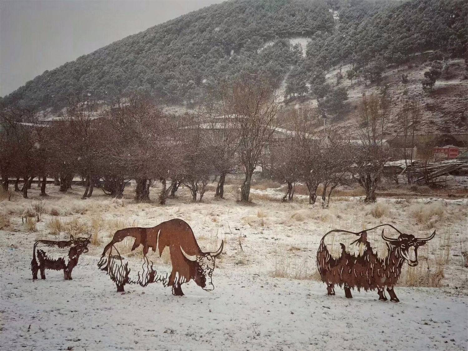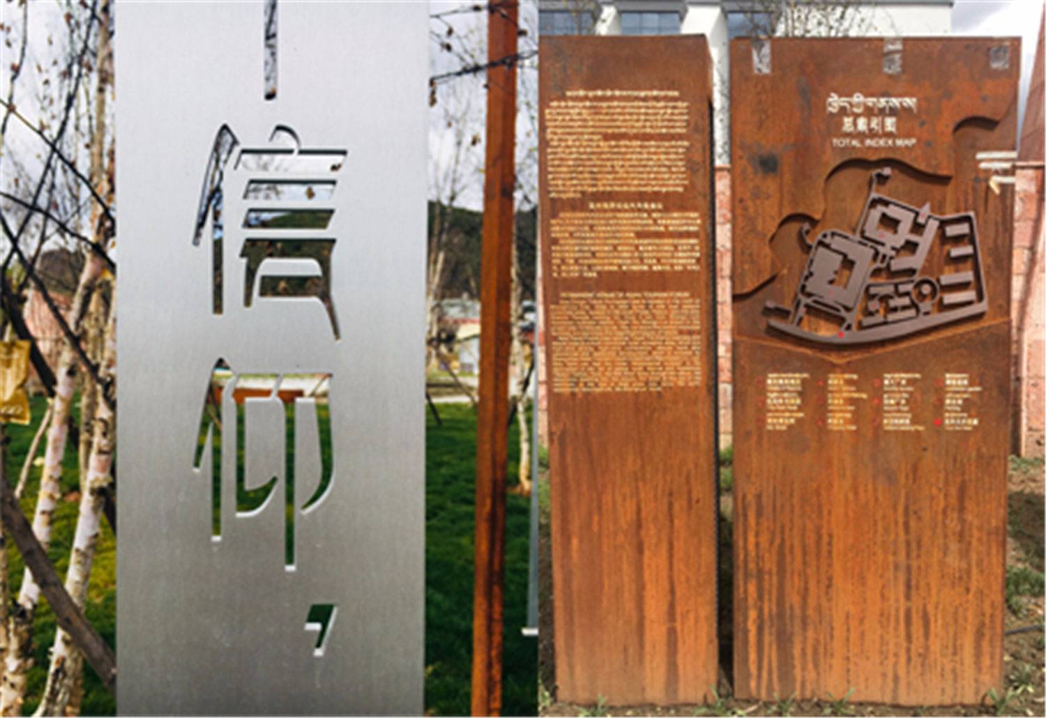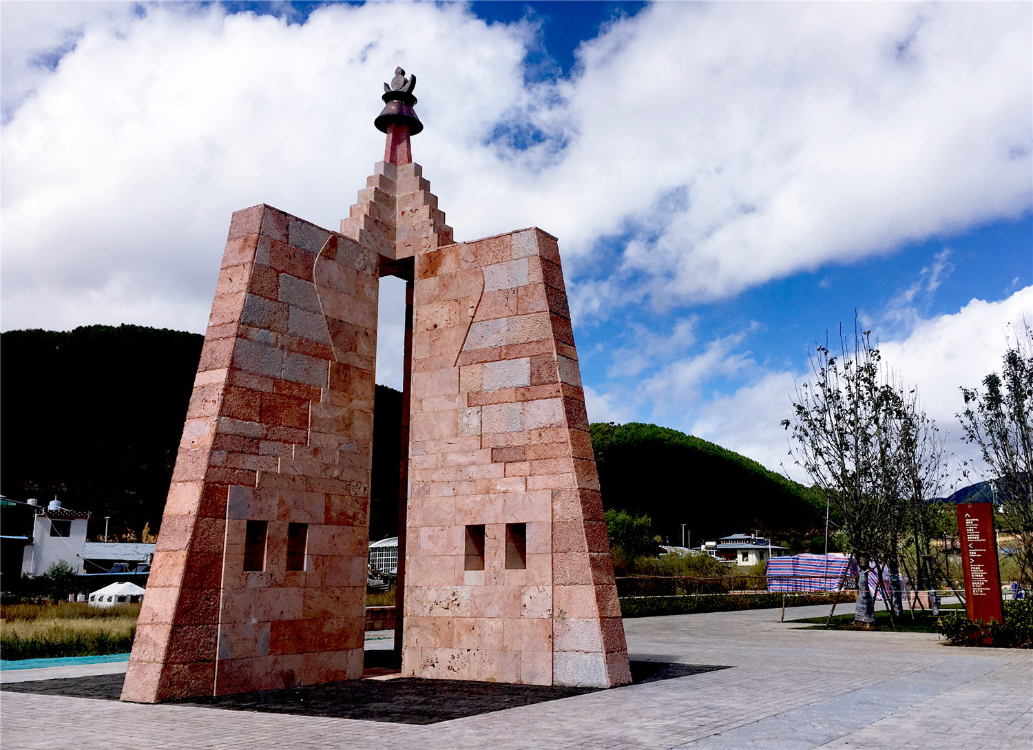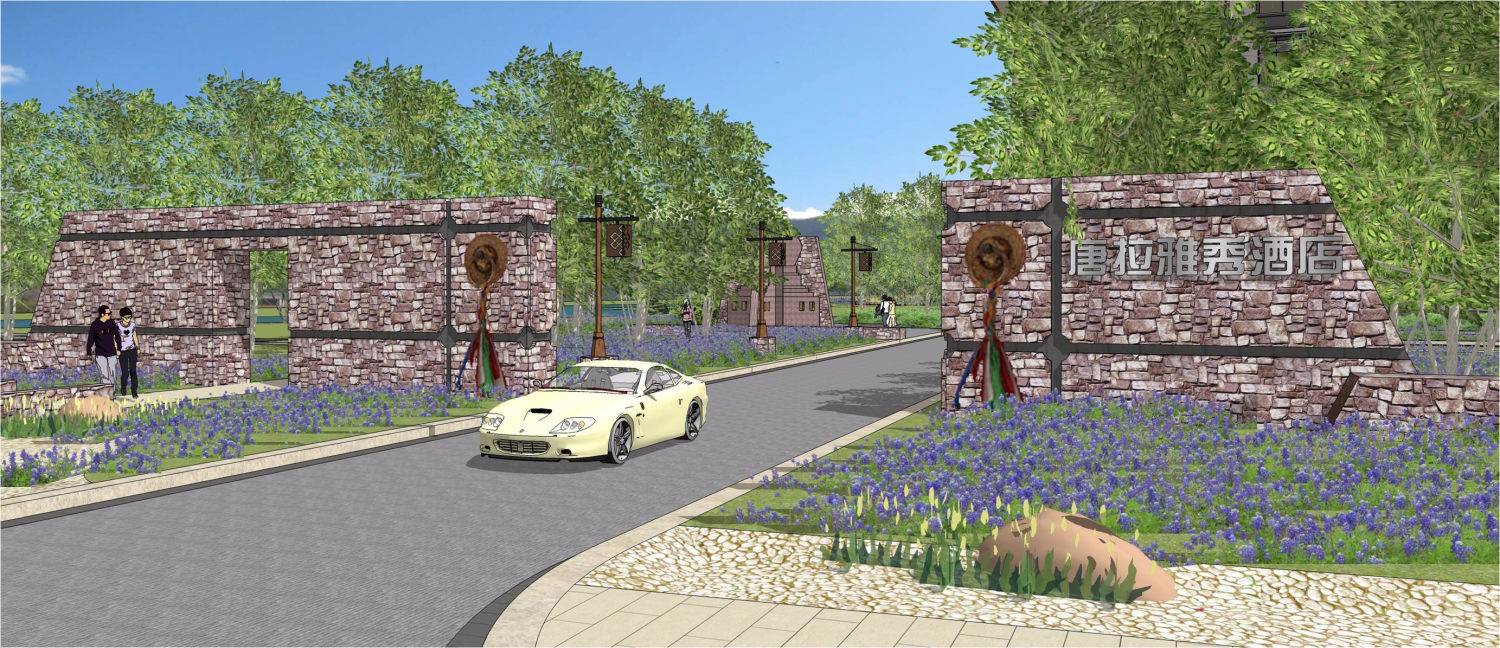場地出口處緊鄰松贊林寺風(fēng)景區(qū)停車場,較雜亂,遠(yuǎn)處可以看到雪山;借用景墻不同的高度來重新規(guī)劃視線,屏蔽進(jìn)出的雜亂,借用遠(yuǎn)處的雪山,營造愜意的入口儀式感。