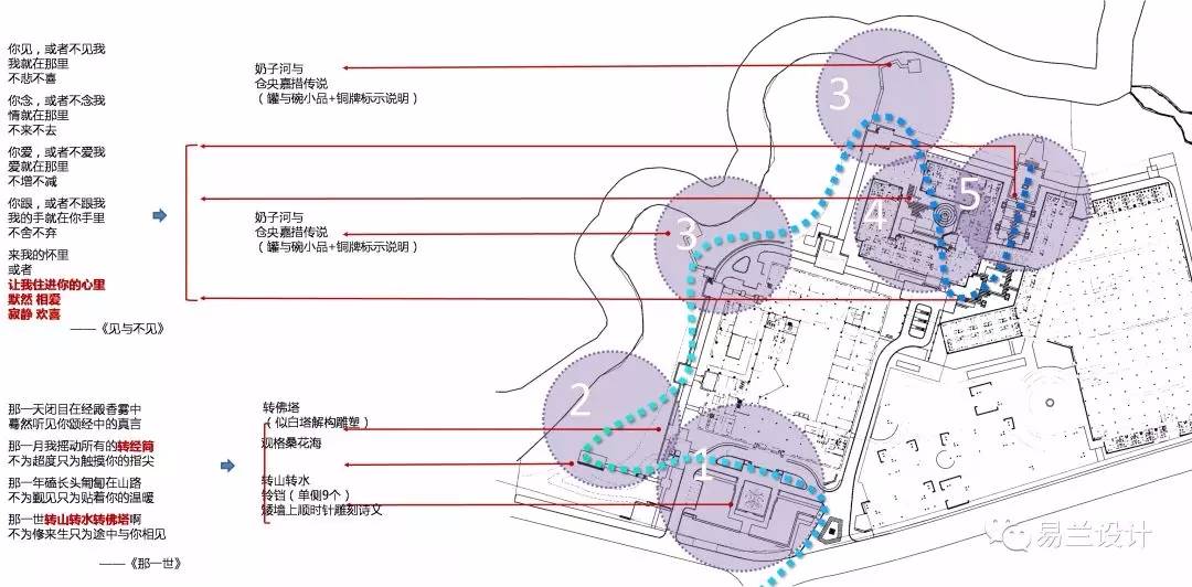 在空間氛圍的營造上將倉央嘉措的優(yōu)美詩句融入鋪裝及小品中,在詩句描繪的優(yōu)美意境中感悟愛情與生活。
