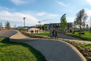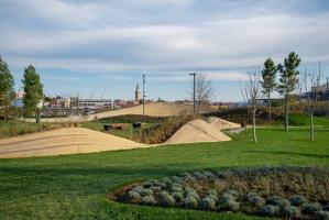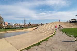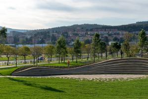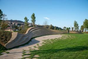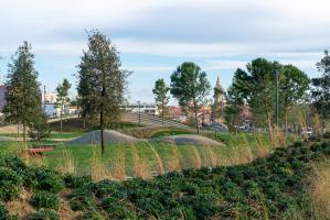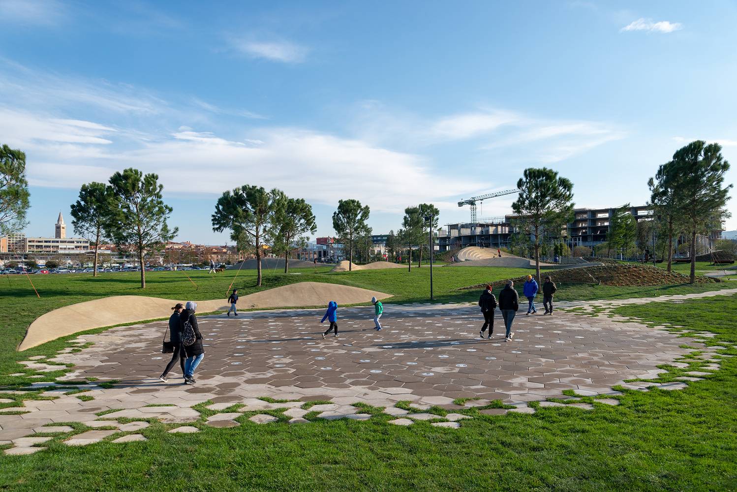 景觀設(shè)計中,大部分植被將使用本土的地中海植物。設(shè)計將特意種植快速長高的植物,與公園兩側(cè)現(xiàn)有的樹林融為一體,并為各個功能區(qū)提供樹蔭,維護(hù)公園內(nèi)部環(huán)境。為了鼓勵空間使用的多樣性,新的城市公園沒有設(shè)計傳統(tǒng)的人行道,而是在公園的入口和部分區(qū)域鋪設(shè)草色瓷磚,未來這種草色瓷磚將鋪設(shè)在更多地方。這樣,游客可以自由選擇路徑。如果有更多活動加入公園,或者形成了明顯的路徑,雖然這很難預(yù)計,但使用這種鋪路方式,二次調(diào)整和鋪設(shè)將非常方便。
