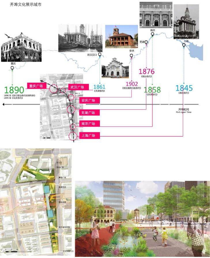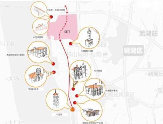 通過(guò)對(duì)這些開(kāi)埠后老洋房的梳理,荷蘭NITA(尼塔)發(fā)現(xiàn)能將許多重要的歷史建筑串聯(lián)在一條空間軸線(xiàn)上,南段包括有中江塔、前英國(guó)領(lǐng)事館、天主教堂、蕪湖舊海關(guān)、王稼祥紀(jì)念館等。往北,這條開(kāi)埠文化線(xiàn)穿越本項(xiàng)目基地,連接北側(cè)的弋磯山醫(yī)院、沈克非、陳翠貞故居等。這條無(wú)形的開(kāi)埠文化線(xiàn),是蕪湖歷史文化的重要游線(xiàn),能夠?yàn)楹芏嘞Mw驗(yàn)西方文化的游客,歸結(jié)出一條重要路徑。