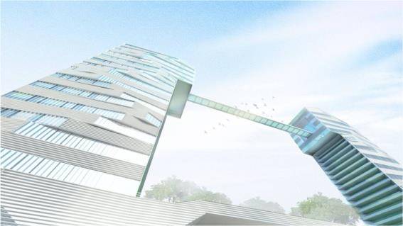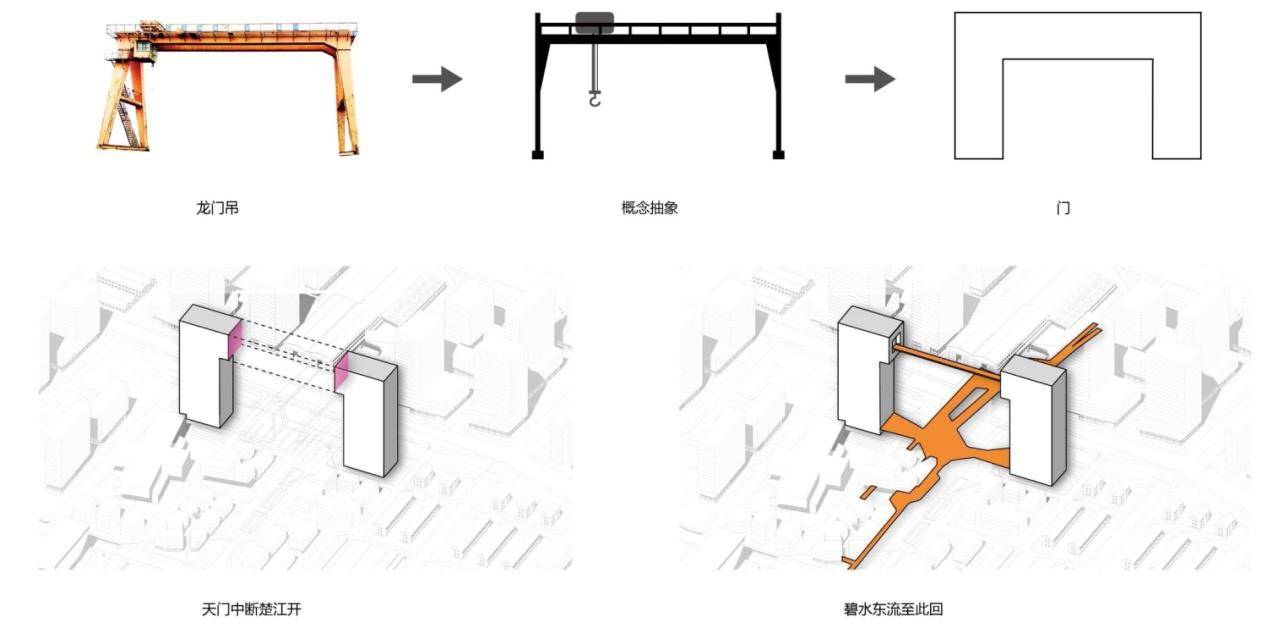 一個(gè)具有文化意義的場(chǎng)所離不開(kāi)標(biāo)志性構(gòu)筑對(duì)場(chǎng)地精神的提煉。本項(xiàng)目的標(biāo)志性建筑位于工業(yè)記憶軸和開(kāi)埠文化軸的交匯處,從李白“天門(mén)中斷楚江開(kāi),碧水東流至此回”的詩(shī)句中,荷蘭NITA(尼塔)領(lǐng)會(huì)其意境并獲得靈感,以視覺(jué)傳達(dá)力極強(qiáng)的“大門(mén)”的形態(tài),高度概括了蕪湖這座城市敞開(kāi)大門(mén),海納百川的文化精神和開(kāi)放姿態(tài)。