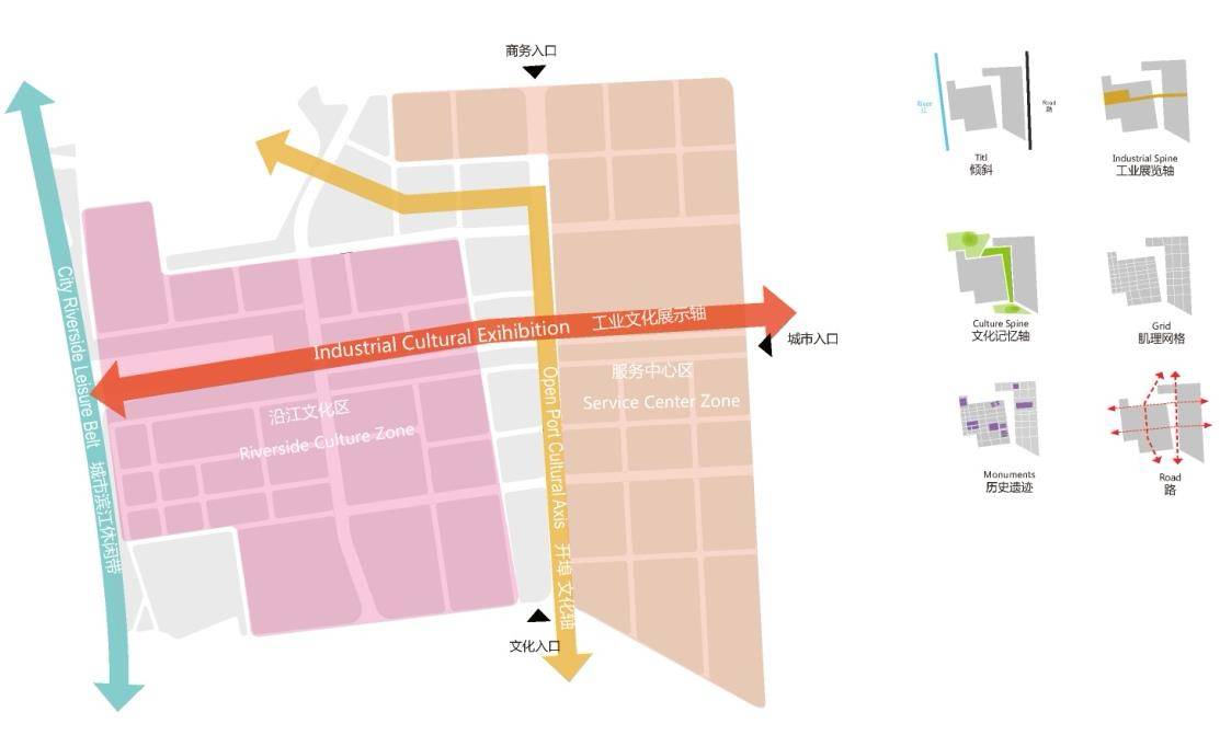 以場(chǎng)地的文化歷史和工業(yè)記憶為主線(xiàn),在造船廠地塊規(guī)劃中組織了三條文化空間軸,分別展示了不同的文化主題,承載了不同的空間功能。