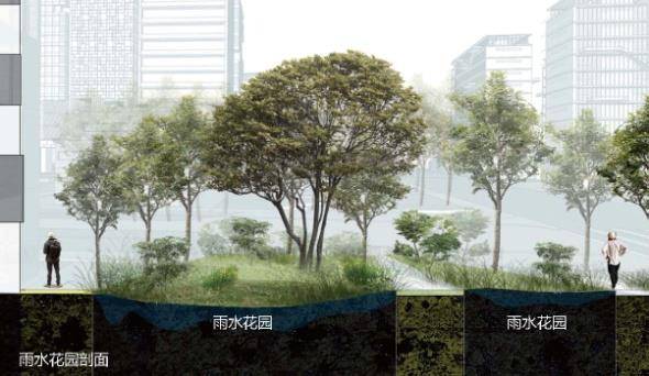 開(kāi)埠文化軸通過(guò)景觀化地形的處理,在步行道兩側(cè)采用下凹綠地和植被淺溝,既能在大雨時(shí)作為海綿體臨時(shí)蓄水,還能再現(xiàn)長(zhǎng)江大堤的印記和景象,成為場(chǎng)所特征的延續(xù)。