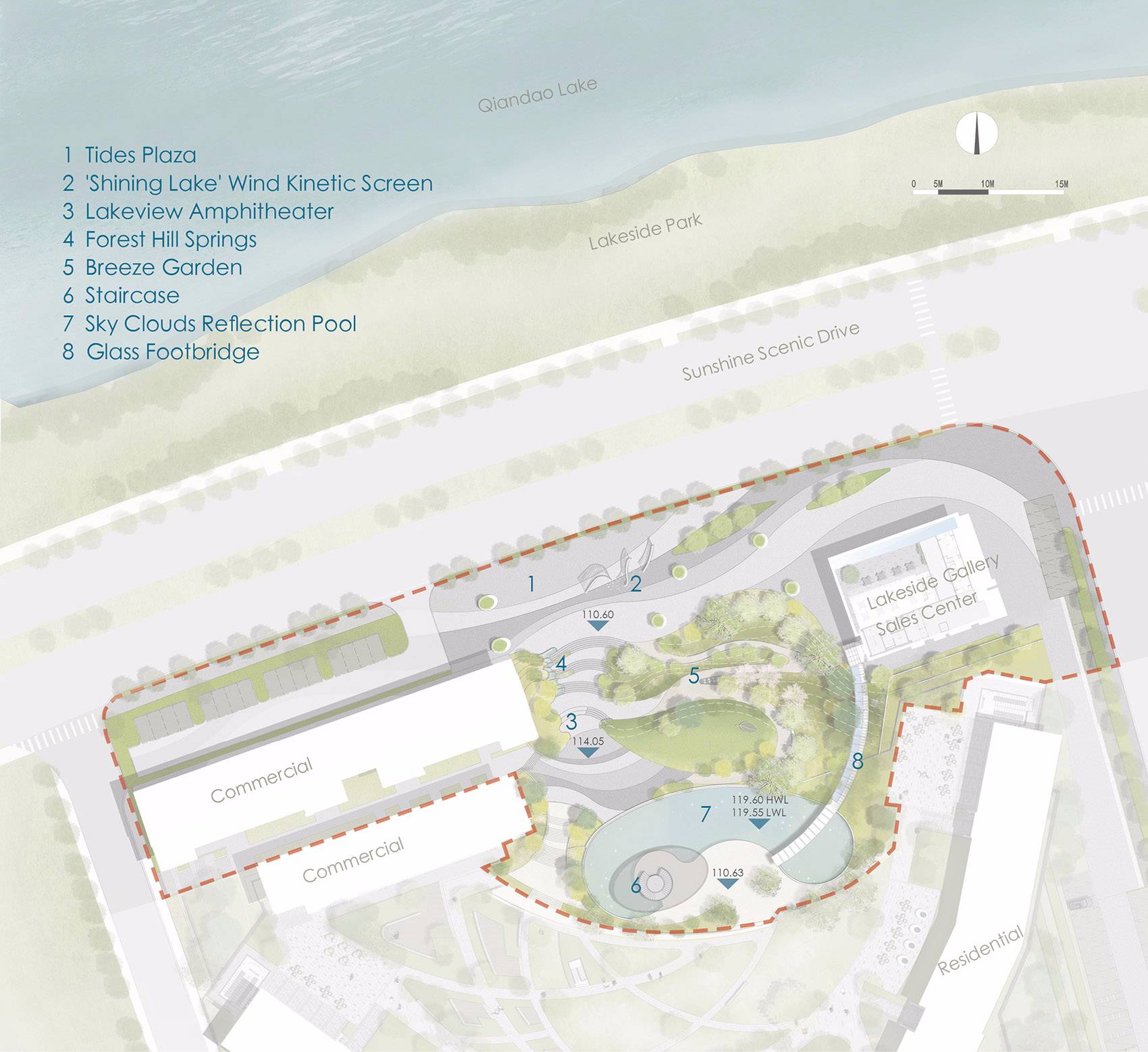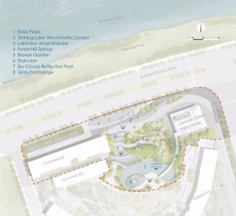 湖濱花園占地面積1公頃,位于千島湖陽光路與規(guī)劃的高層湖景住宅區(qū)之間。景觀設(shè)計(jì)始于場地規(guī)劃,通過塑造地形,創(chuàng)造了一個(gè)穿梭于山水間的戲劇性空間序列,展現(xiàn)風(fēng)景如畫的湖畔之旅。