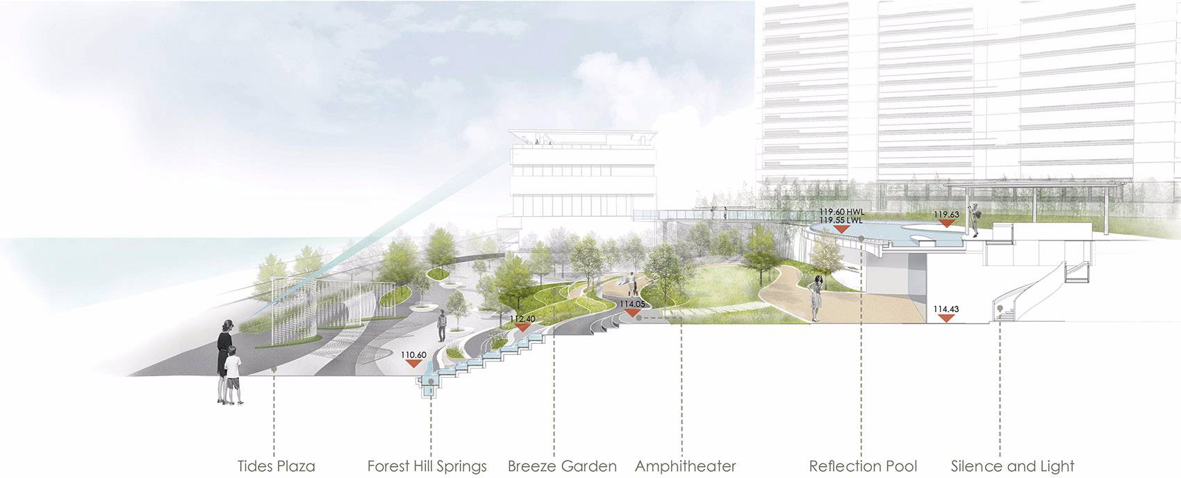 訪客空間體驗(yàn)從潮汐廣場開始,一個(gè)波浪形式的聚會空間。地面的芝麻黑、芝麻灰、芝麻白花崗巖組合形式,形成閃亮湖面的一種微妙映畫。