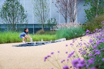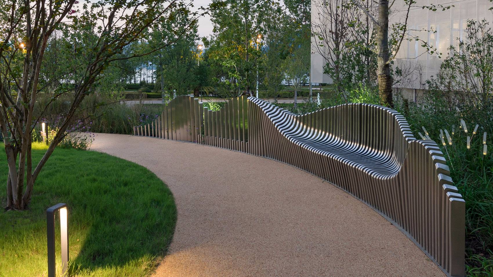 微風(fēng)花園中,隨風(fēng)搖曳的觀賞草類,與微光互動的視覺藝術(shù)裝置,搭配高低錯(cuò)落的植物層次。地面的米色水洗石為花園鋪墊了一層溫暖的色調(diào)。