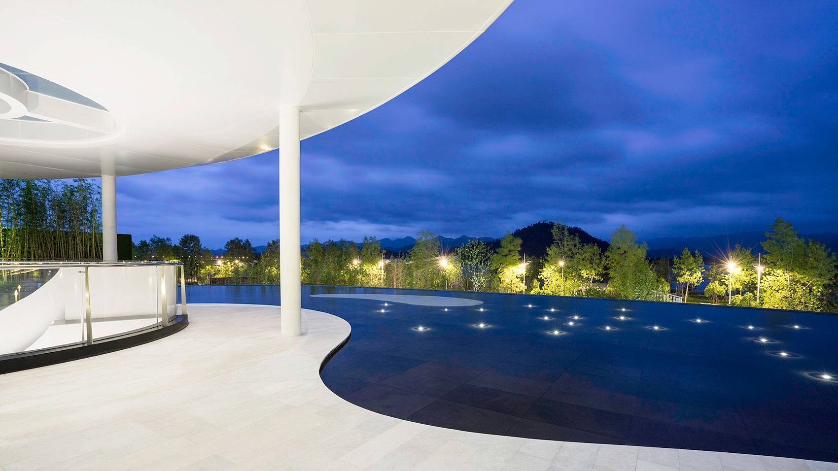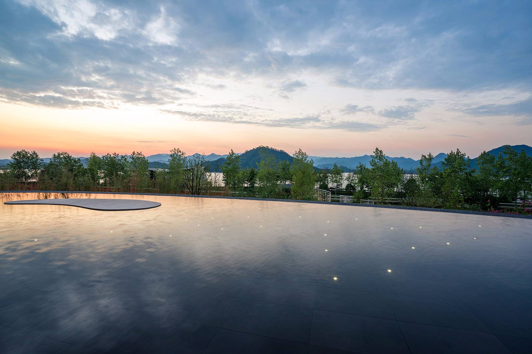 無邊界池底與遠(yuǎn)處的湖泊和山脈融為一體,池底的閃爍“星空”喚起了“水下古村落”的詩意形象,回憶起千島湖獨(dú)特而多愁的歷史。鏡池的水位設(shè)計(jì)為高低變化5cm,靜中有微動,形成一種對千島湖獨(dú)有的季節(jié)性水位變化的隱喻。一個(gè)白色的“島”設(shè)置在高水位以下3cm處,作為一個(gè)舞臺,為獨(dú)舞表演營造“漂浮于水面”的戲劇性視覺效果。