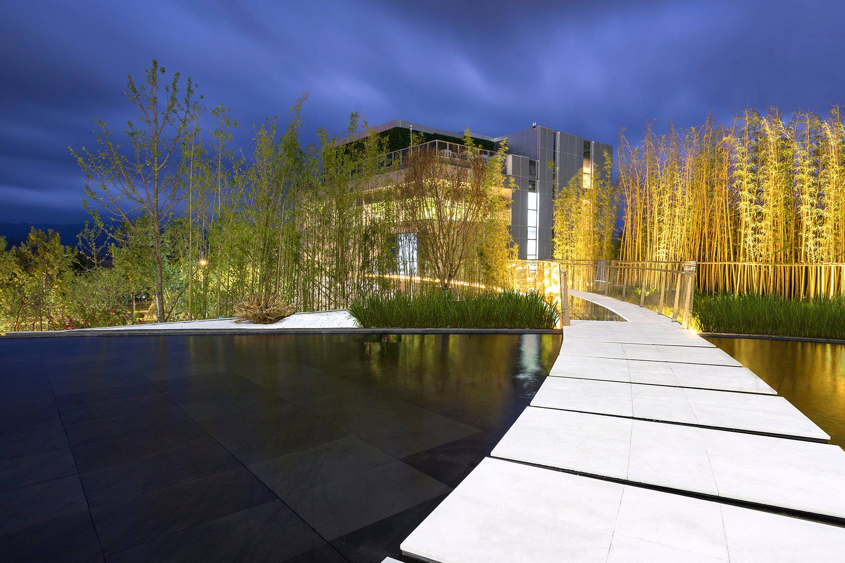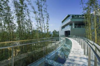 曲線玻璃廊橋穿過搖曳的竹林,抵達(dá)湖畔畫廊前創(chuàng)造了一個(gè)寧靜的時(shí)刻。