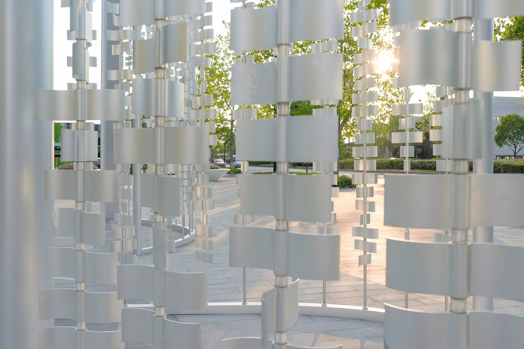 ▼風(fēng)動雕塑“波光粼粼的湖面”創(chuàng)造了一個(gè)迎賓序曲