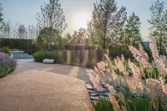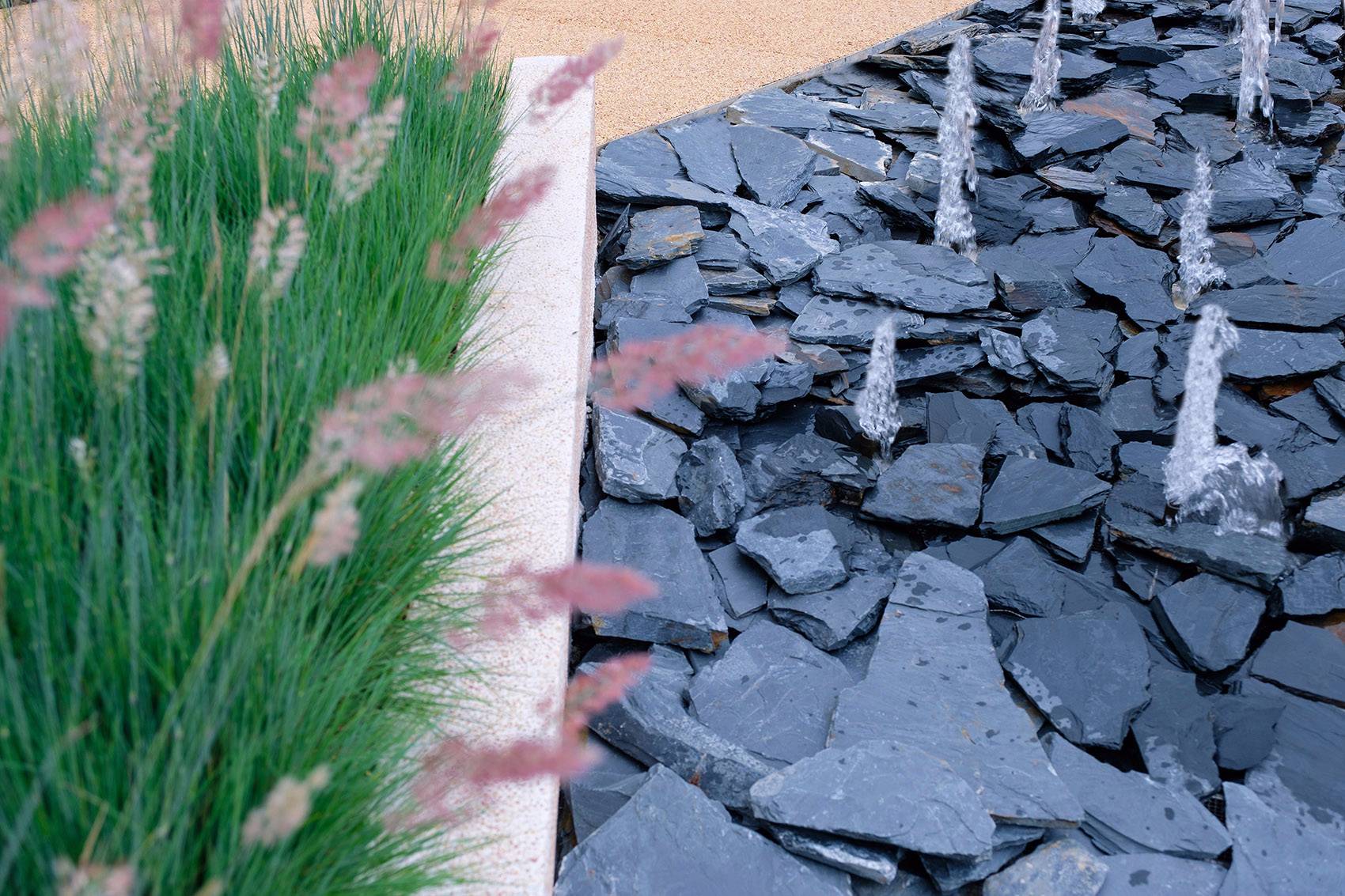 ▼深灰色板巖,米色混凝土,搖曳的觀賞草類