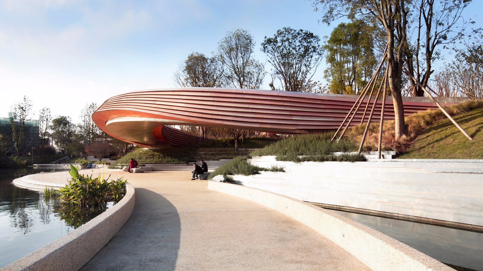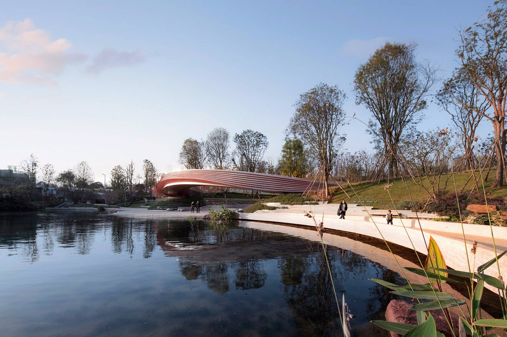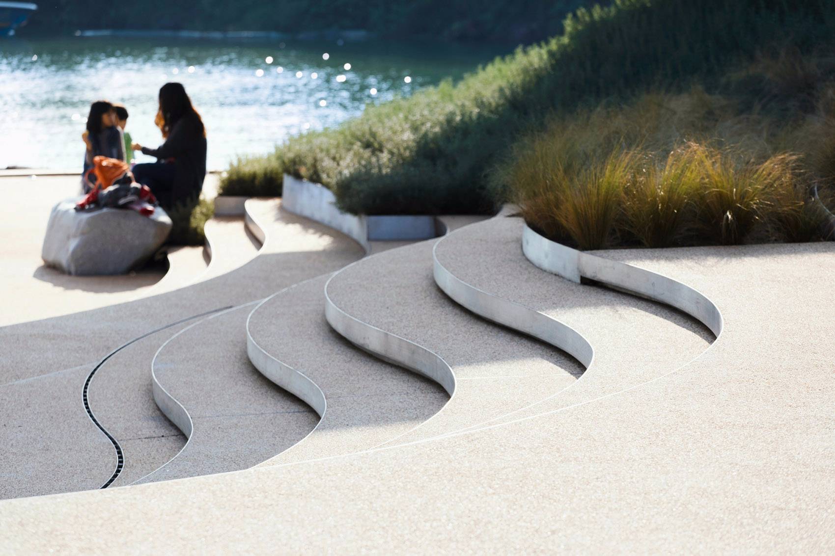 ▼谷地設(shè)計(jì)的概念,來自湖面產(chǎn)生的水波,從湖中一層層蔓延至駁岸