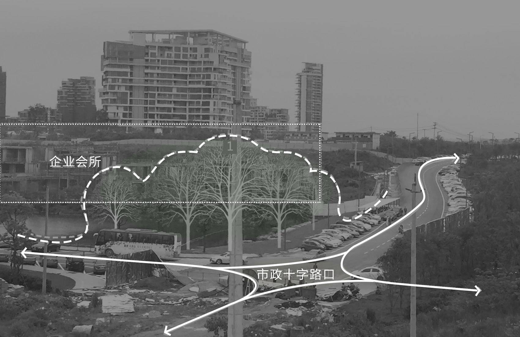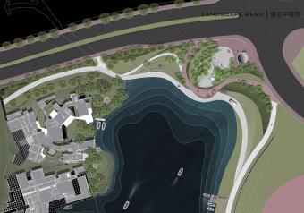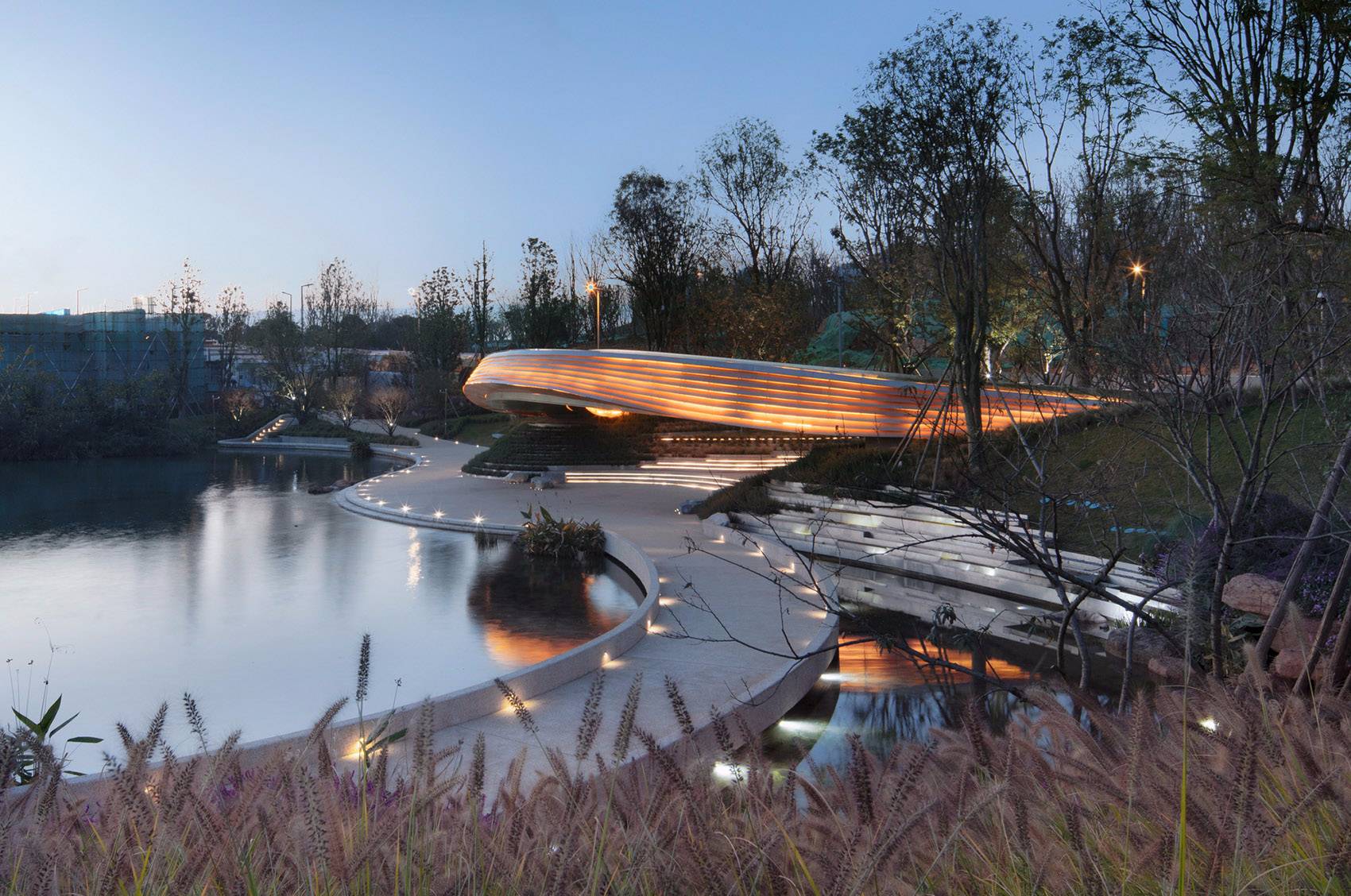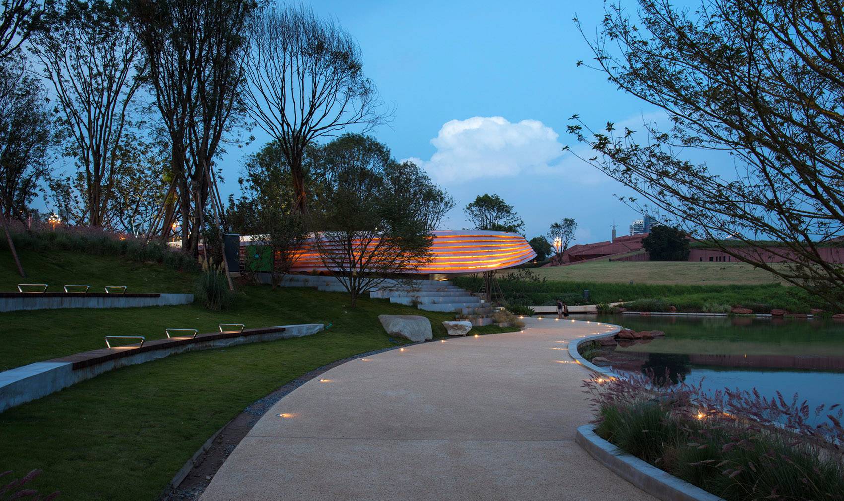 項(xiàng)目所在地是麓湖藝展中心與市政路、湖區(qū)交匯處的一段濱水公共綠地,是麓湖在入口區(qū)域與城市共享的一個節(jié)點(diǎn)。因依附于雕塑感很強(qiáng)的藝展中心主體建筑,因此命名為藝展公園。