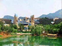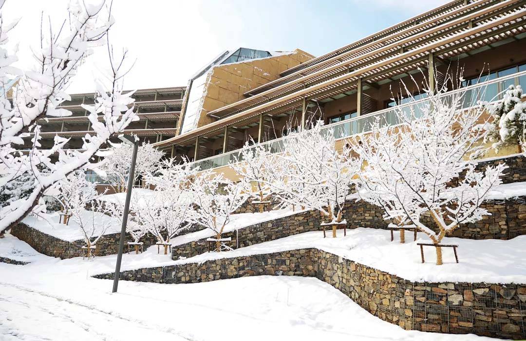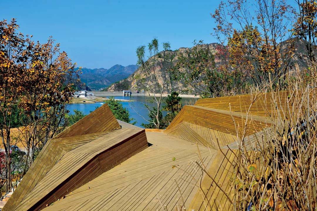 項(xiàng)目區(qū)位依山傍水,建筑設(shè)計(jì)希望整個(gè)建筑群落能夠如磐石般錯(cuò)落疊置于山坡上,背山環(huán)抱一汪湖水,構(gòu)成依山觀水之勢(shì)。整個(gè)酒店分為山下的運(yùn)動(dòng)休閑區(qū)、山腰間的主體建筑群及山頂?shù)母呒?jí)套房區(qū)。在將北側(cè)水庫中的湖水引入后,最大化了湖景。景觀設(shè)計(jì)延續(xù)了建筑設(shè)計(jì)方的設(shè)計(jì)理念,同時(shí)更加重視周邊自然環(huán)境與建筑之間的關(guān)系,使景觀以“無我”的狀態(tài)存在其中,利用原生優(yōu)越的自然環(huán)境,酒店及周邊景觀共同突出“游山、玩水、畫中游”的設(shè)計(jì)理念。景觀設(shè)計(jì)方尊重建筑的設(shè)計(jì)手法,同時(shí)融合自身的設(shè)計(jì)理念,將建筑中的室外疏散樓梯、擋土墻、室外平臺(tái)、院落等功能性載體景觀化,以融合于大環(huán)境為特色,與步行系統(tǒng)串聯(lián)而成系統(tǒng)的游賞路線。