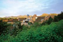 設(shè)計(jì)中更加重視建筑、景觀及自然環(huán)境三者之間的銜接與畫面感。高級(jí)套房區(qū)與主體建筑呈夾峙之勢(shì),其間有水池倒影藍(lán)天白云、青山綠草與建筑,一橋從池上掠過,幾道景觀擋墻從建筑兩側(cè)延展出來,起落間插入遠(yuǎn)邊的樹林綠坡,跌水從墻間流淌而出,造成建筑自山間自然生長(zhǎng)而出的視覺效果。
