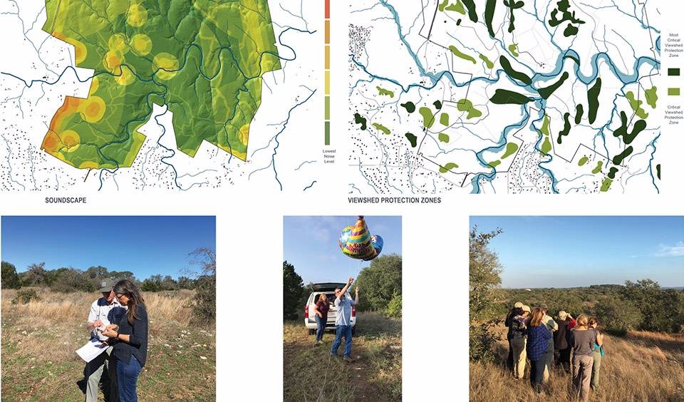 ▲視域和聲景保護(hù):為了讓游客能夠充分沉浸于得克薩斯州丘陵地帶的景觀當(dāng)中,規(guī)劃團(tuán)隊(duì)對(duì)場(chǎng)地的視域和聲景進(jìn)行了分析。這一基于GIS的獨(dú)特分析方法能夠模擬出未來(lái)的景觀情境,并通過(guò)智能手機(jī)和氣球等工具進(jìn)行了實(shí)地驗(yàn)證。