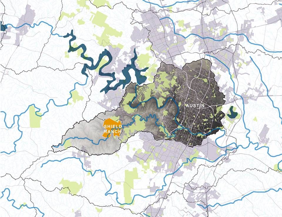 Shield牧場(chǎng)地處美國(guó)西南部(98度經(jīng)線),在氣候變化和人口增長(zhǎng)帶來(lái)的極端影響下,這里被認(rèn)為是一個(gè)“危險(xiǎn)地帶”。大規(guī)模的風(fēng)暴會(huì)為該區(qū)域帶來(lái)長(zhǎng)時(shí)間的干旱,并會(huì)隨著氣候變化不斷加劇。從地理位置上看,牧場(chǎng)位于Edwards高原(30c生態(tài)區(qū))的Balcones峽谷和巴頓河流域。該流域的河水流向Edwards的蓄水層補(bǔ)給帶,為超過(guò)200萬(wàn)人口提供了生活用水,同時(shí)也會(huì)受到Shield牧場(chǎng)的水文狀況以及附近大規(guī)模土地使用活動(dòng)的影響?;趶椥缘囊?guī)劃,該方案利用物理性的干預(yù)和長(zhǎng)期的管理措施來(lái)緩解這些壓力,并試圖解決得克薩斯丘陵地帶的居民所面臨的一系列困擾,包括棲息地的喪失、公共基礎(chǔ)設(shè)施和道路的修建、水資源的短缺、水質(zhì)不佳、火災(zāi)風(fēng)險(xiǎn)、光污染和噪音污染,以及可視域的退化等等。