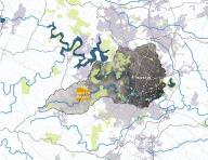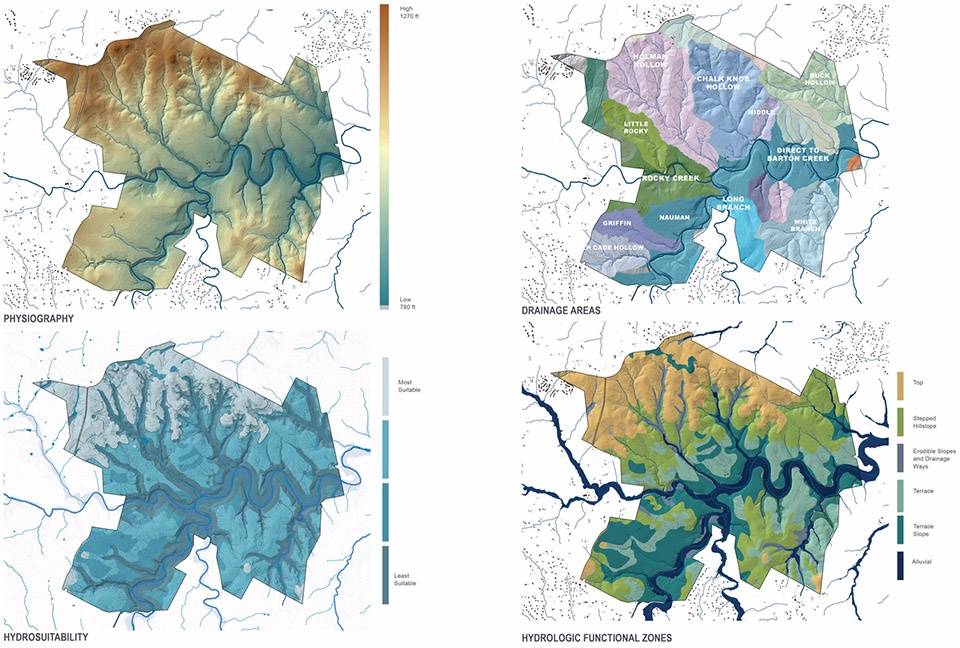 ▲流域測(cè)繪:基于GIS繪制的水文地質(zhì)分析圖,展示了未來(lái)的河漫灘、陡坡、引流管道、地質(zhì)構(gòu)造之間的界限以及容易受到侵蝕的土壤,并根據(jù)水體運(yùn)動(dòng)的類(lèi)型學(xué)劃分出不同區(qū)域。