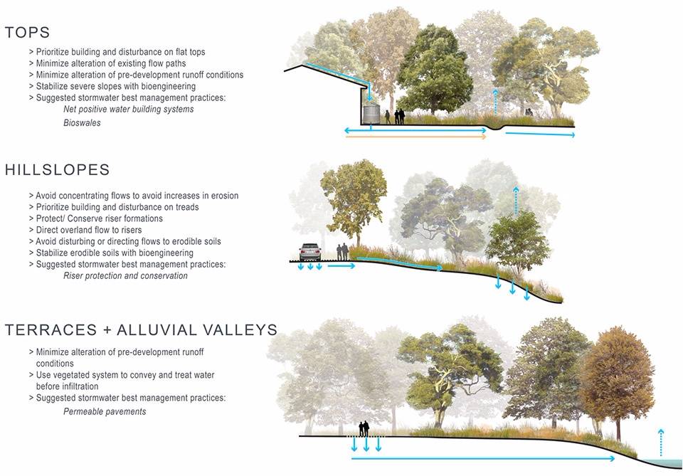 ▲肌理和演變:植被、水體以及復(fù)雜的地質(zhì)是景觀最重要的特征。這三者之間的關(guān)系對(duì)于整個(gè)地區(qū)地下水資源的健康狀況起到關(guān)鍵性的作用,同時(shí)也是總體規(guī)劃中最重要的考慮因素。