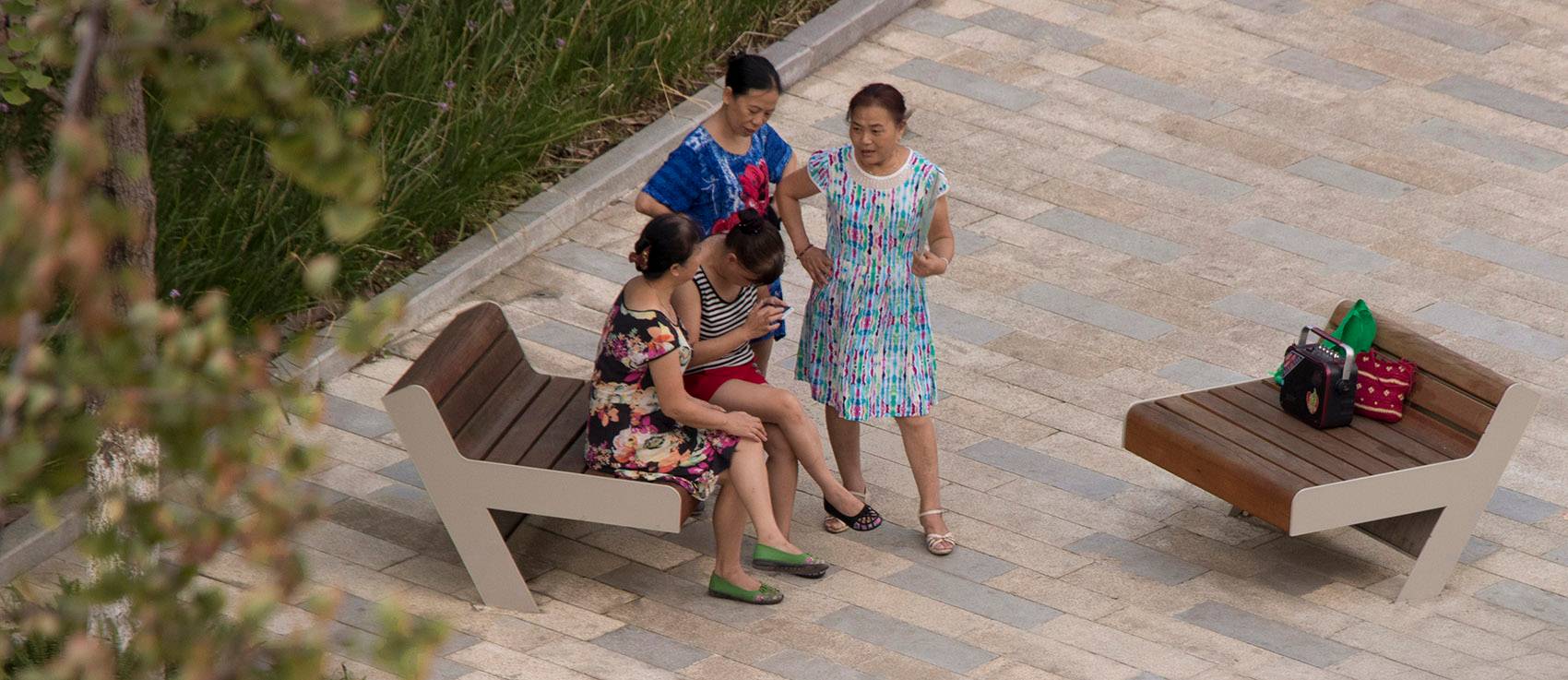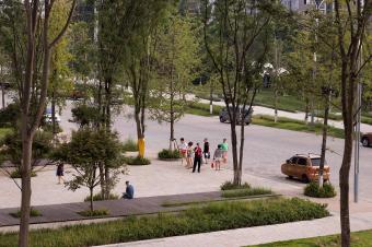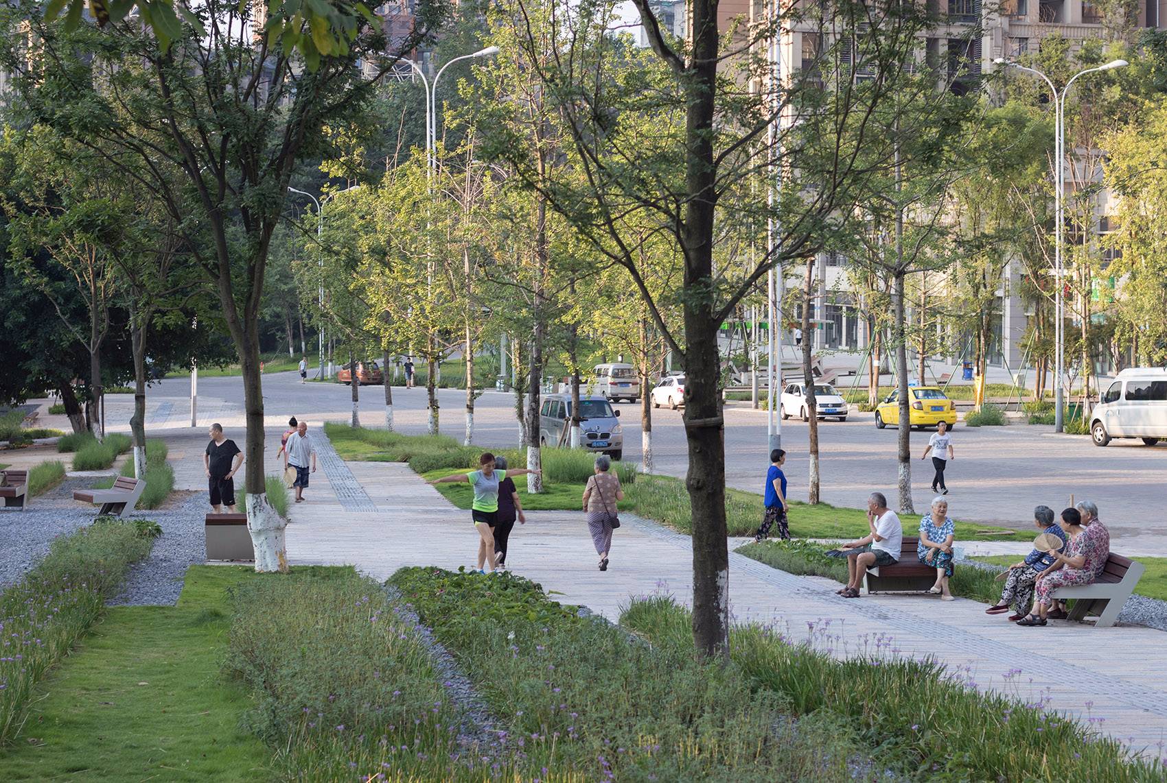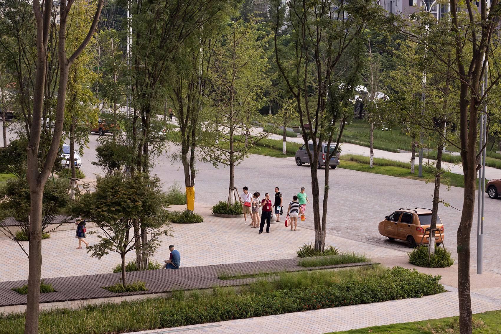 道路原有的沿街銀杏樹,在保留下來后通過增加和穿插其他種類的成樹,從行道樹變成了開放公園的一部分。成年的、遮蔭類的樹木是重慶炎熱的夏天,人們能夠繼續(xù)街道生活的基本要素。除此之外,工作室還設(shè)計(jì)了一組用吊掛彩色有機(jī)玻璃板構(gòu)成的天蓬,這些玻璃板在日光下將其豐富的色彩投射到地面和草皮上,成為復(fù)雜而生動(dòng)的自然陰影。這樣做的初衷是為了調(diào)節(jié)改善周邊塔樓、城市背景和時(shí)而灰霾天氣帶來的壓抑的灰色調(diào)。在關(guān)鍵的開放空間,布置有一組大尺度的預(yù)制鋼木座凳,這些座凳的樣式是可坐可爬的“波浪”平臺(tái)??梢杂糜诖笮突蛐⌒途蹠?huì),吸引兒童在上面玩耍,同時(shí)它們還充當(dāng)了新的心理信號(hào),提醒司機(jī)在路過時(shí)注意減速。小號(hào)的座凳大多集中在公園綠地,以提供給更需要安靜的個(gè)人使用。