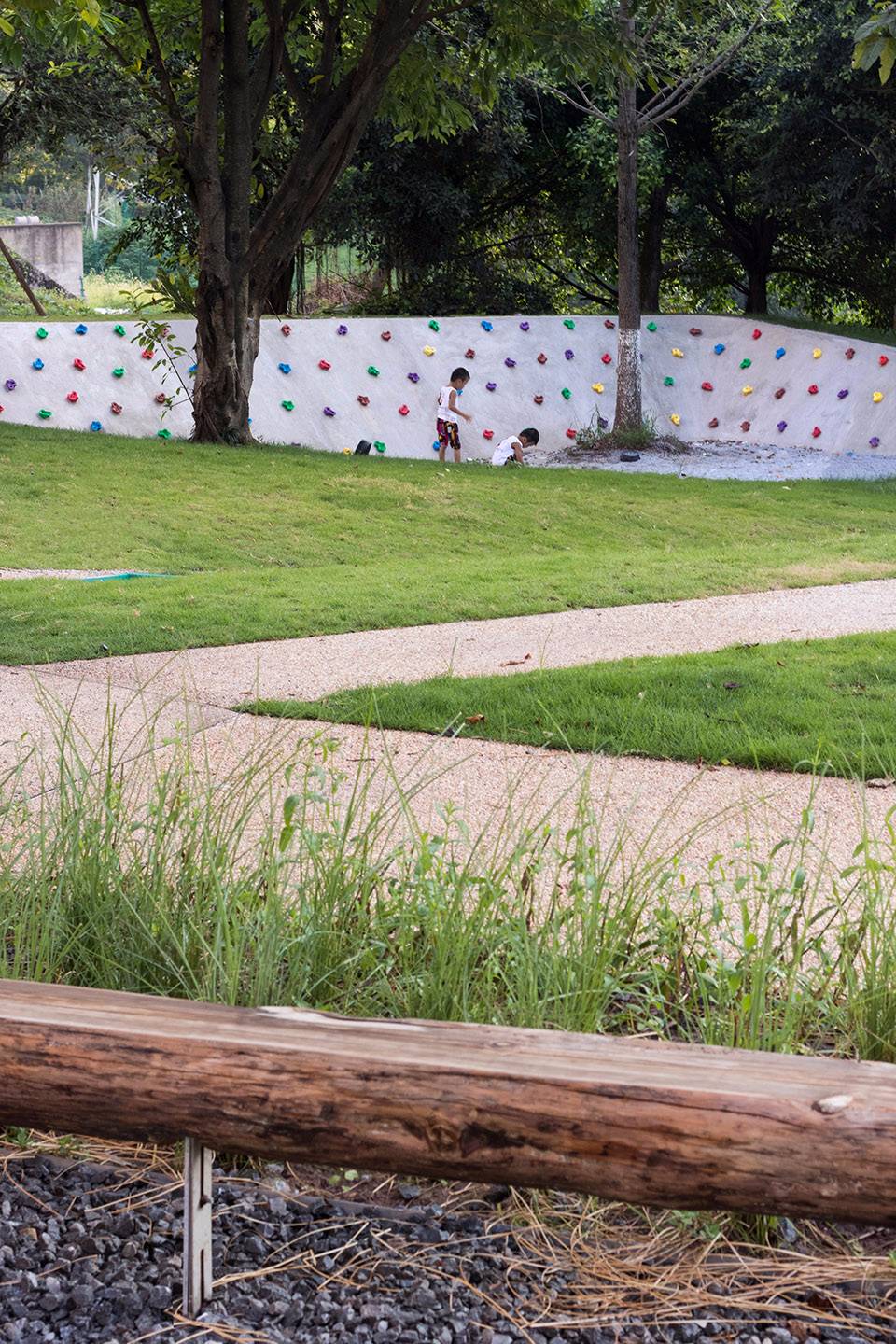 ▼公園南端的兒童活動(dòng)場,高低起伏的斜坡綠地和攀巖墻壁營造了兒童在自然中玩耍的印象