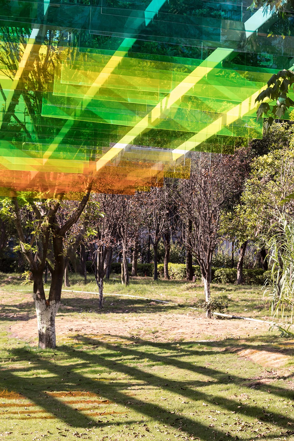 ▼天蓬的玻璃板在日光下將其豐富的色彩投射到地面和草皮上