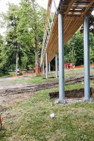 路徑的布局需要保持高度謹(jǐn)慎,同時還要突顯出景觀的特征。為此,設(shè)計團(tuán)隊(duì)在路徑的初始部分設(shè)置了一座人行橋,即使是行動不便的人群也能夠在此享受到海岸的美景。這座壯觀的人行橋長一百多米,從樹林深入一直延伸到英式風(fēng)格的公園。橋頂?shù)挠^景臺懸浮在城市上空,帶來市區(qū)和瓦茲的絕佳風(fēng)景。橋身以鋼結(jié)構(gòu)和橡木及落葉松木打造,能夠抵御地震和強(qiáng)風(fēng)。