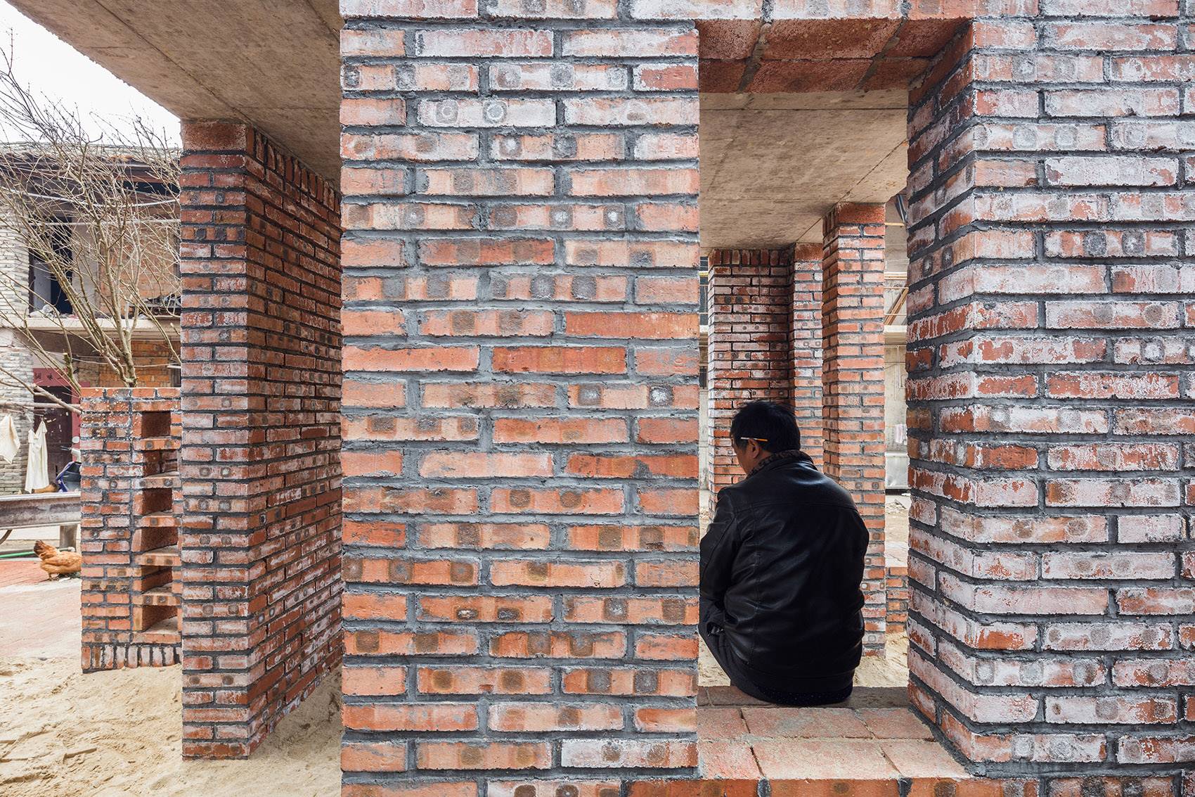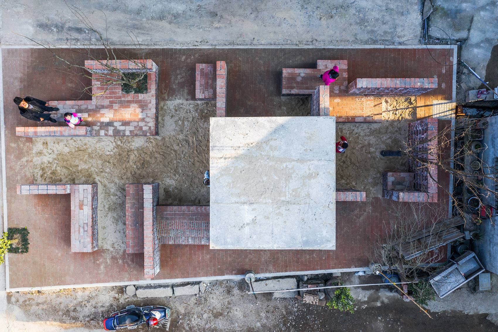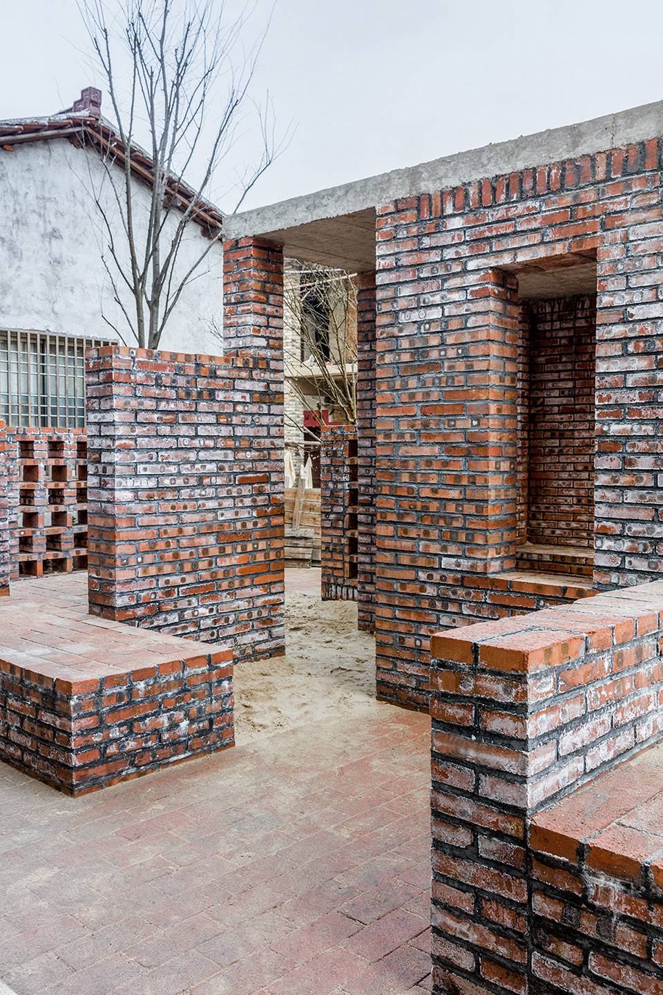 紅磚砌筑了一些供村民休息的座位、臺階、舞臺、片墻,還有一個半私密的磚盒,它們像是一種限制沙的邊界。