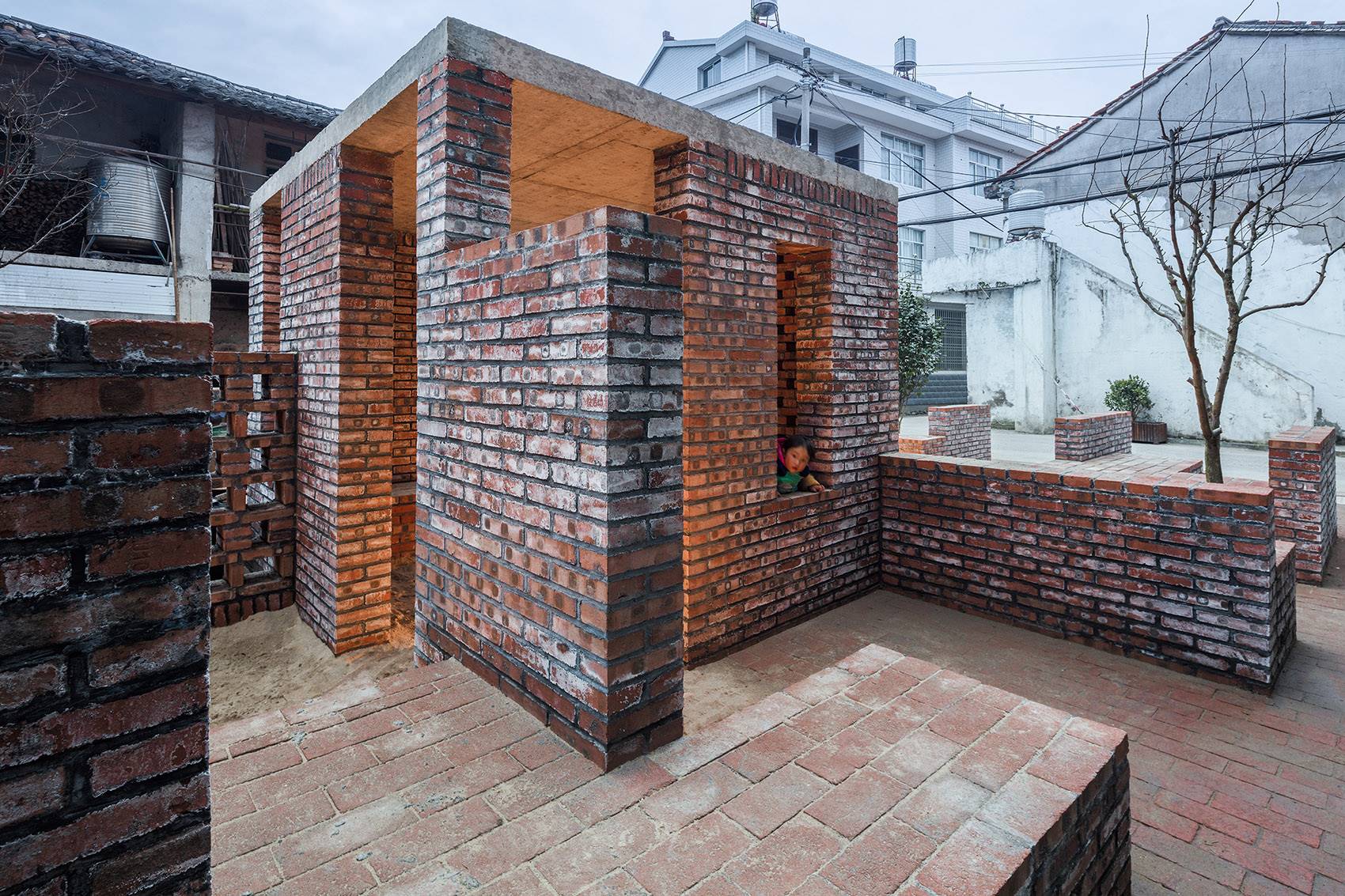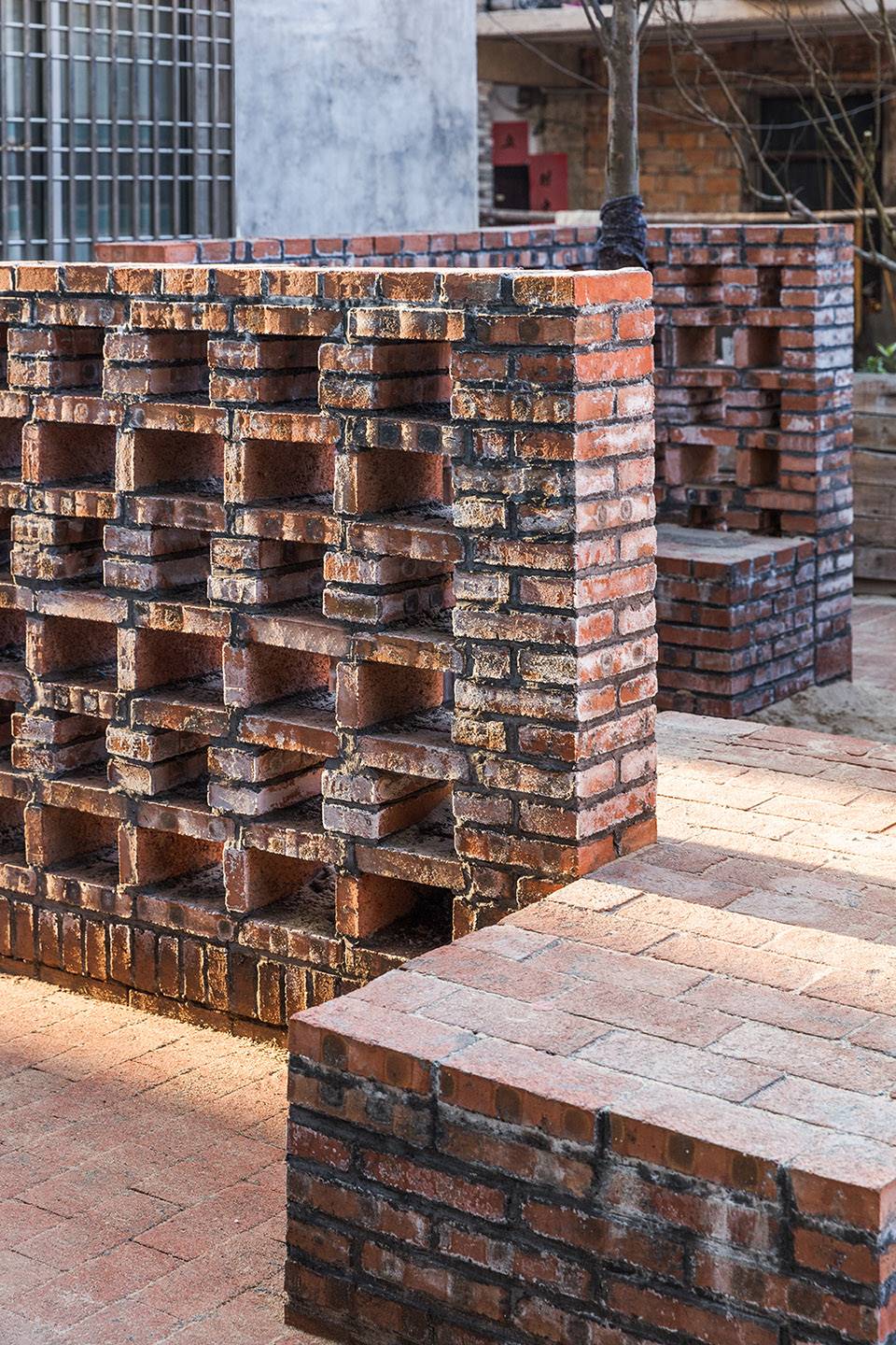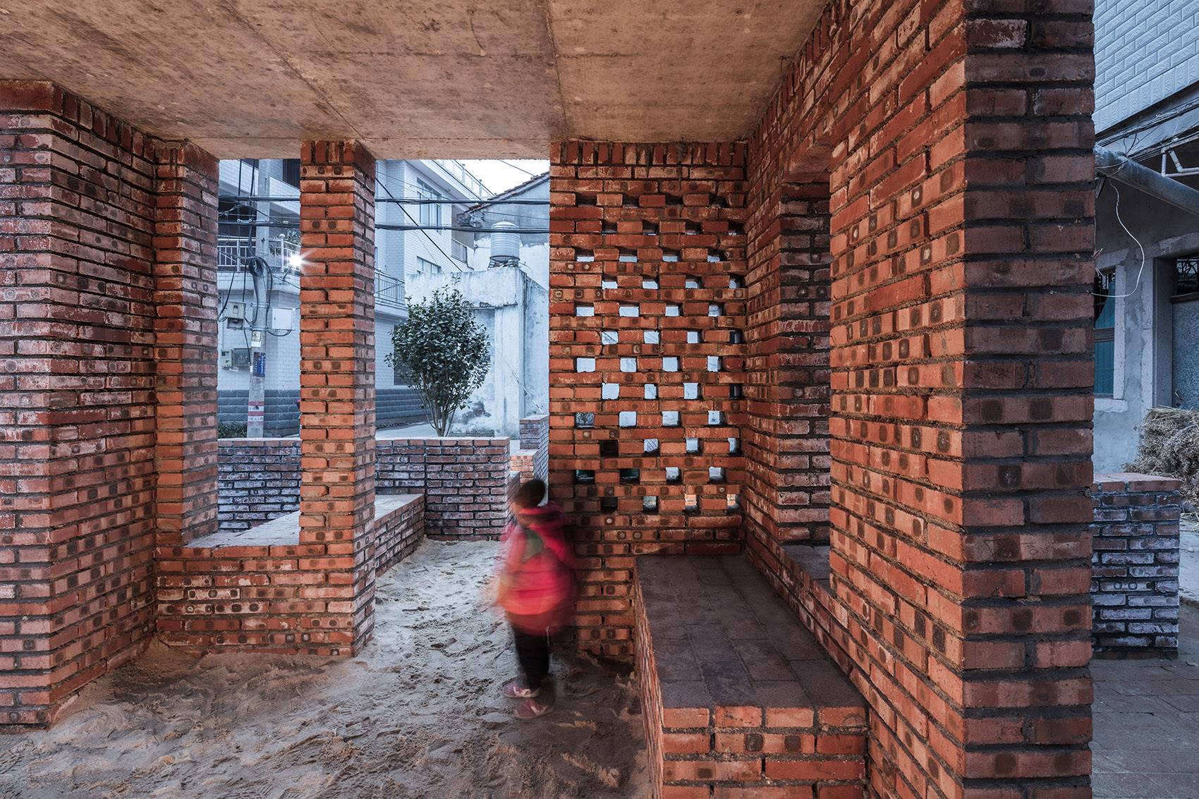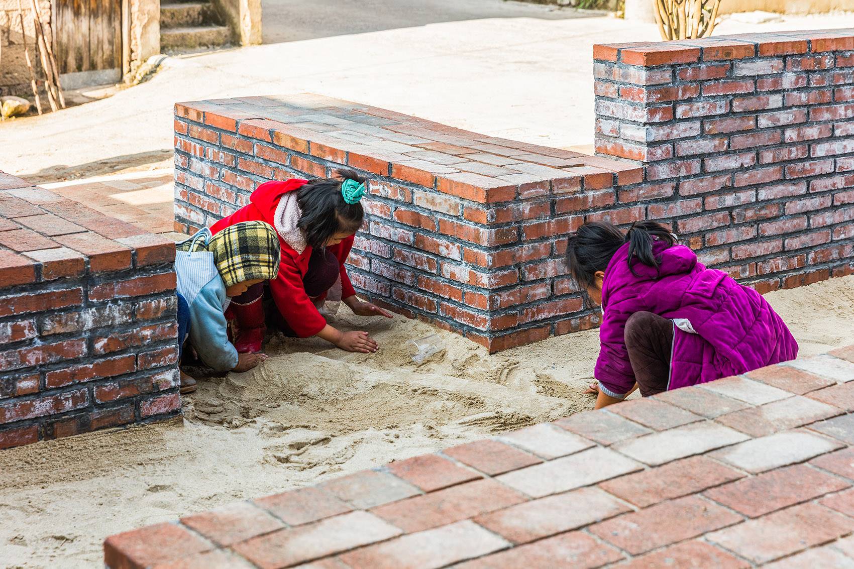 場地中的沙池分成了三個小區(qū)域,他們分別為開放、半開放與私密,三種狀態(tài)。第一部分為0.8m高的矮墻與磚砌椅子;第二部分為2.2m高的磚盒子;第三部分為墻高1.5m的鏤空磚墻。尺寸與尺度在成人與小孩之間互換,座椅—舞臺 矮墻—高墻 沙坑—世界,豐富的場所滿足小孩內(nèi)心活動的不同映射。